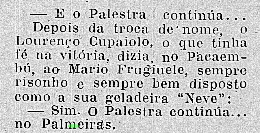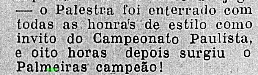 Após uma semana extremamente conturbada com o episódio da mudança de nome, o agora Palmeiras ainda teria de findar uma derradeira missão naquele ano. Durante todo o tempo que o time jogou com o nome de Palestra de São Paulo, realizou uma campanha um tanto quanto satisfatória no Campeonato Paulista: em 18 partidas, o time esmeraldino acumulou 16 vitórias e 2 empates, balançando as redes adversárias incríveis 61 vezes e sofrendo apenas 15 gols. Tal desempenho colocava o Palestra na liderança absoluta da competição.