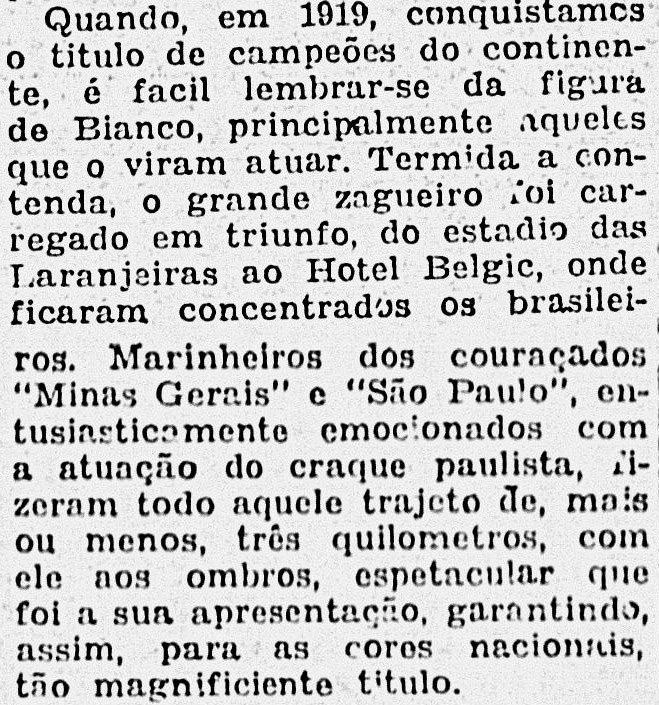 Bianco é um dos símbolos da primeira geração de palestrinos. Talvez o maior, ao lado de Heitor. Estreou no clube quando o próprio clube fazia sua estreia e ainda sonhava em se firmar no cenário futebolístico da capital, e saiu de cena tendo contribuído sobremaneira para que o Palestra se tornasse uma potência esportiva e o clube mais popular do estado na época.