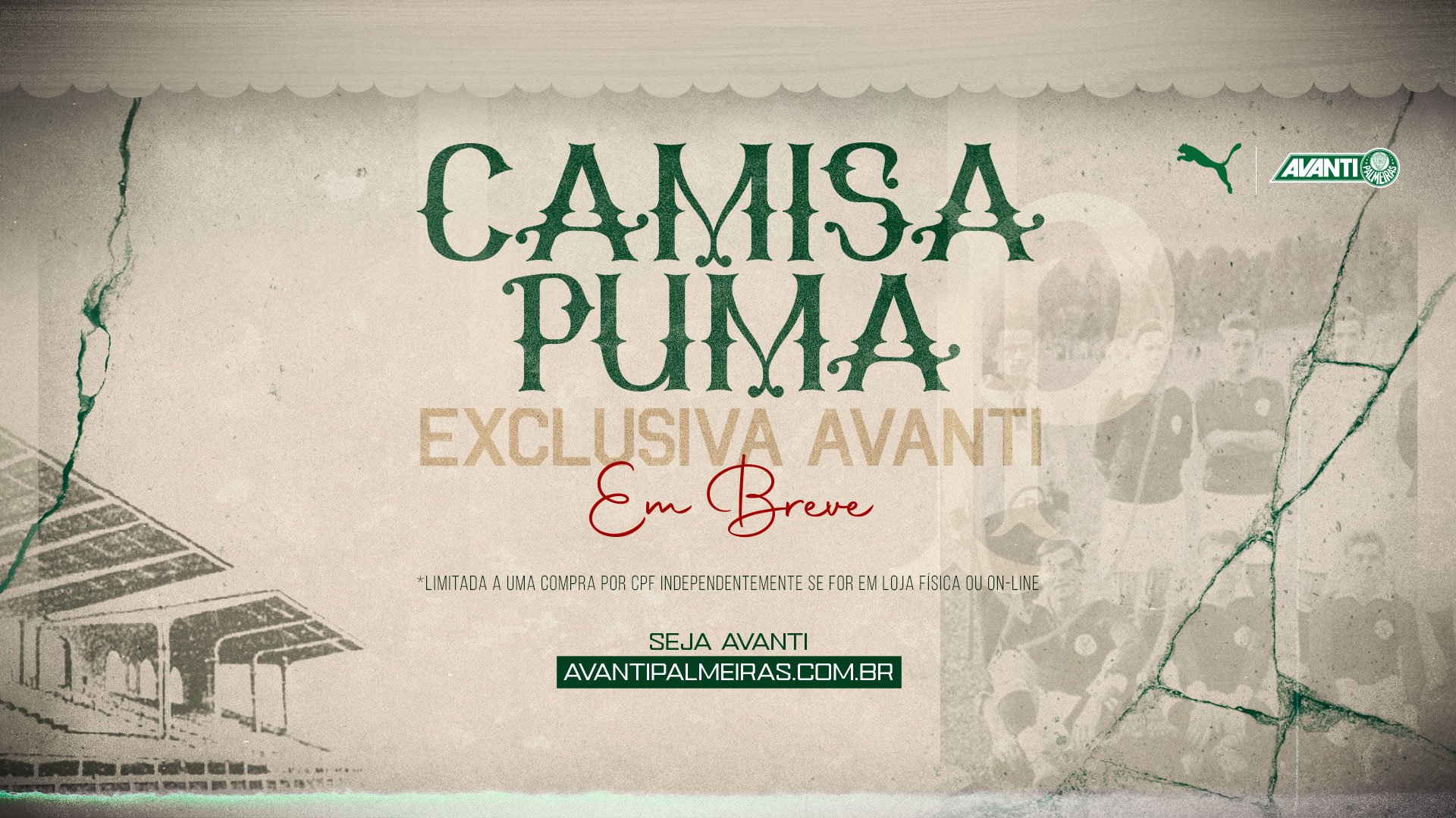 O Palmeiras e a PUMA lançarão na próxima terça-feira (20), data em que se comemora o Dia do Palmeiras, uma camisa oficial exclusiva para os inscritos no programa Avanti. A comercialização ocorrerá somente na Palmeiras Store.com e nas lojas físicas da Palmeiras Store (clique aqui e confira a unidade mais próxima de você!).