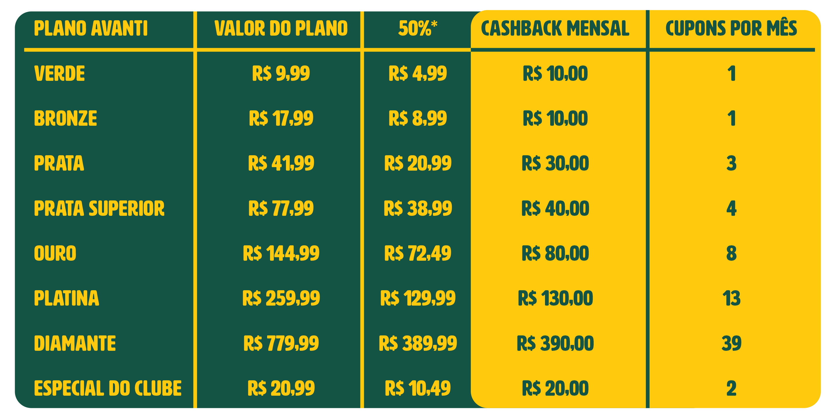 *Plano Verde: sócios deste plano receberão 100% da mensalidade em cupom, já que o valor mínimo de cada cupom é de R$ 10,00.