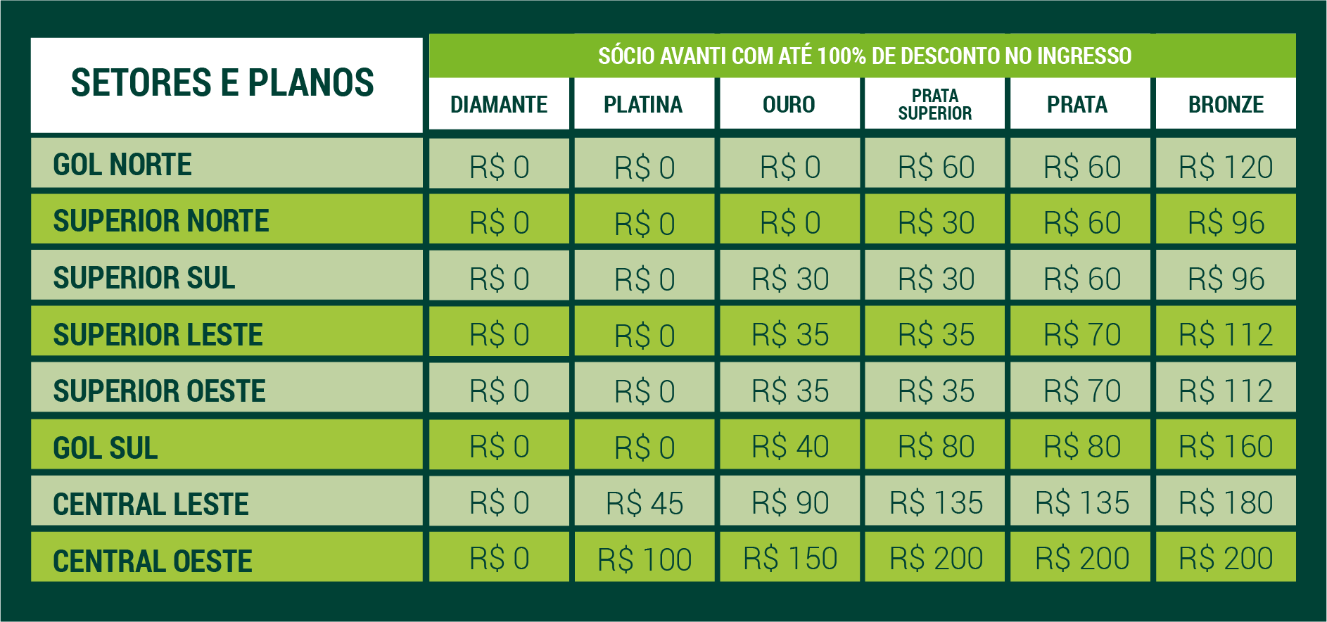 Torcedores que não fazem parte do Programa Avanti podem comprar os seus ingressos com os seguintes preços: