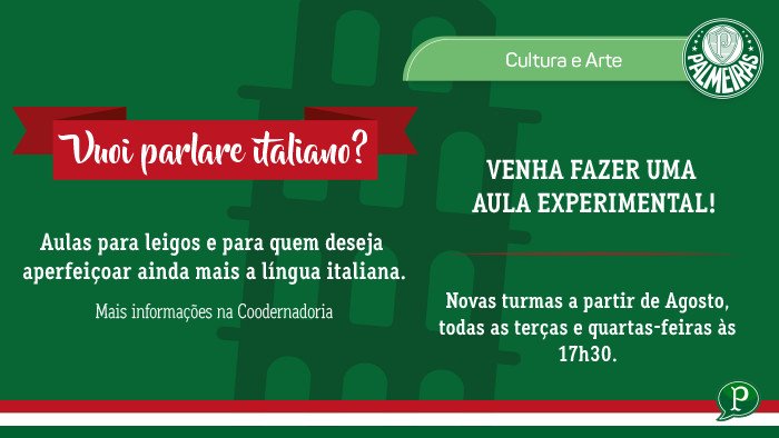 Verdão abre novas turmas para aulas de italiano no clube; faça uma aula experimental