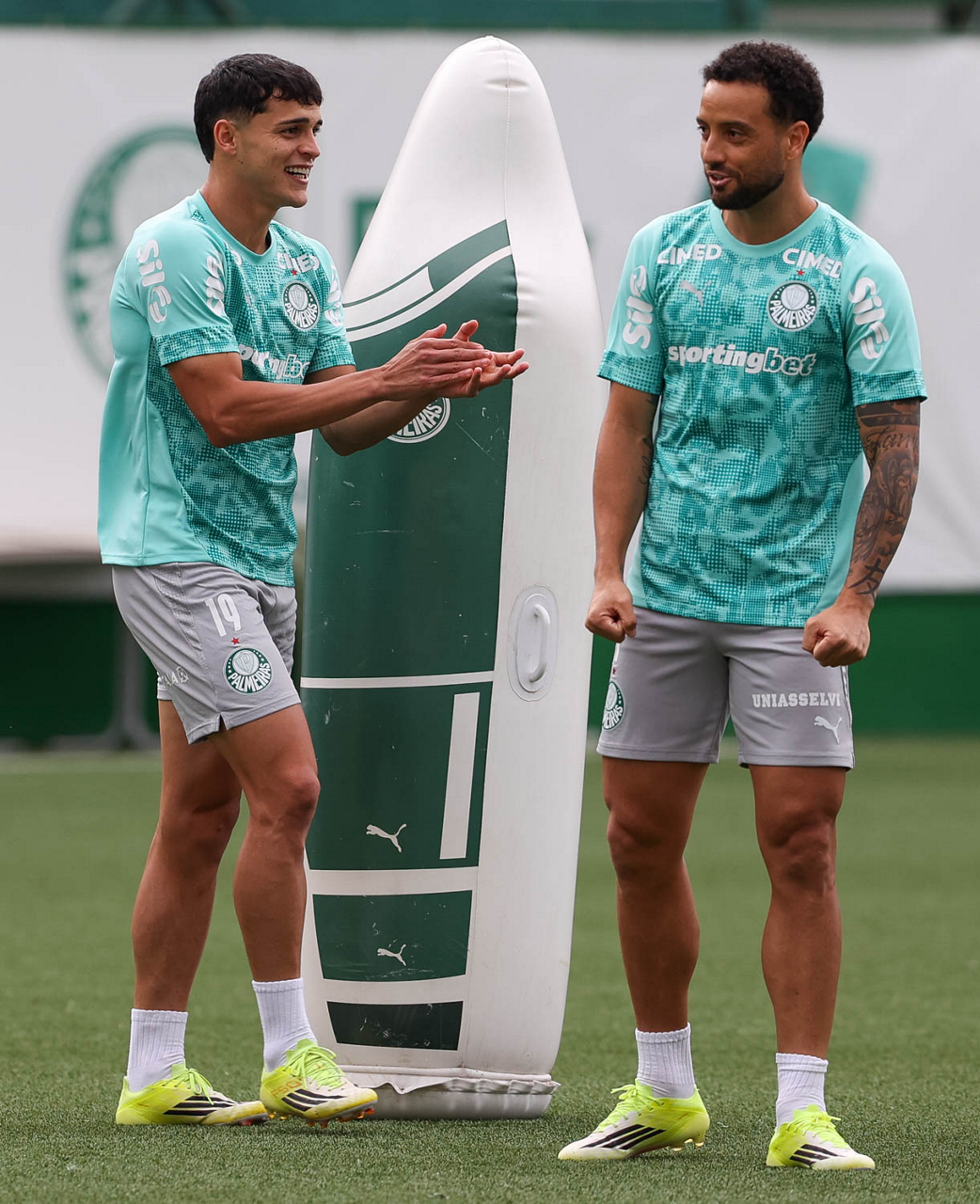 Os jogadores Ramón Sosa e Felipe Anderson (D), da SE Palmeiras, durante treinamento, na Academia de Futebol. (Foto: Cesar Greco/Palmeiras/by Canon)