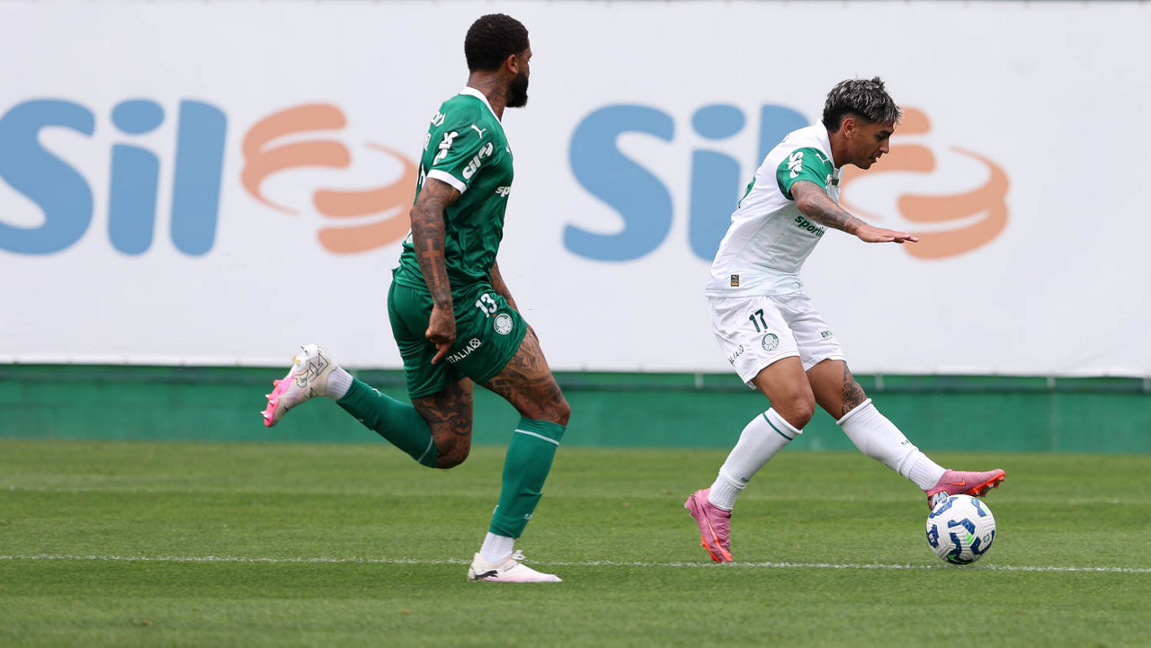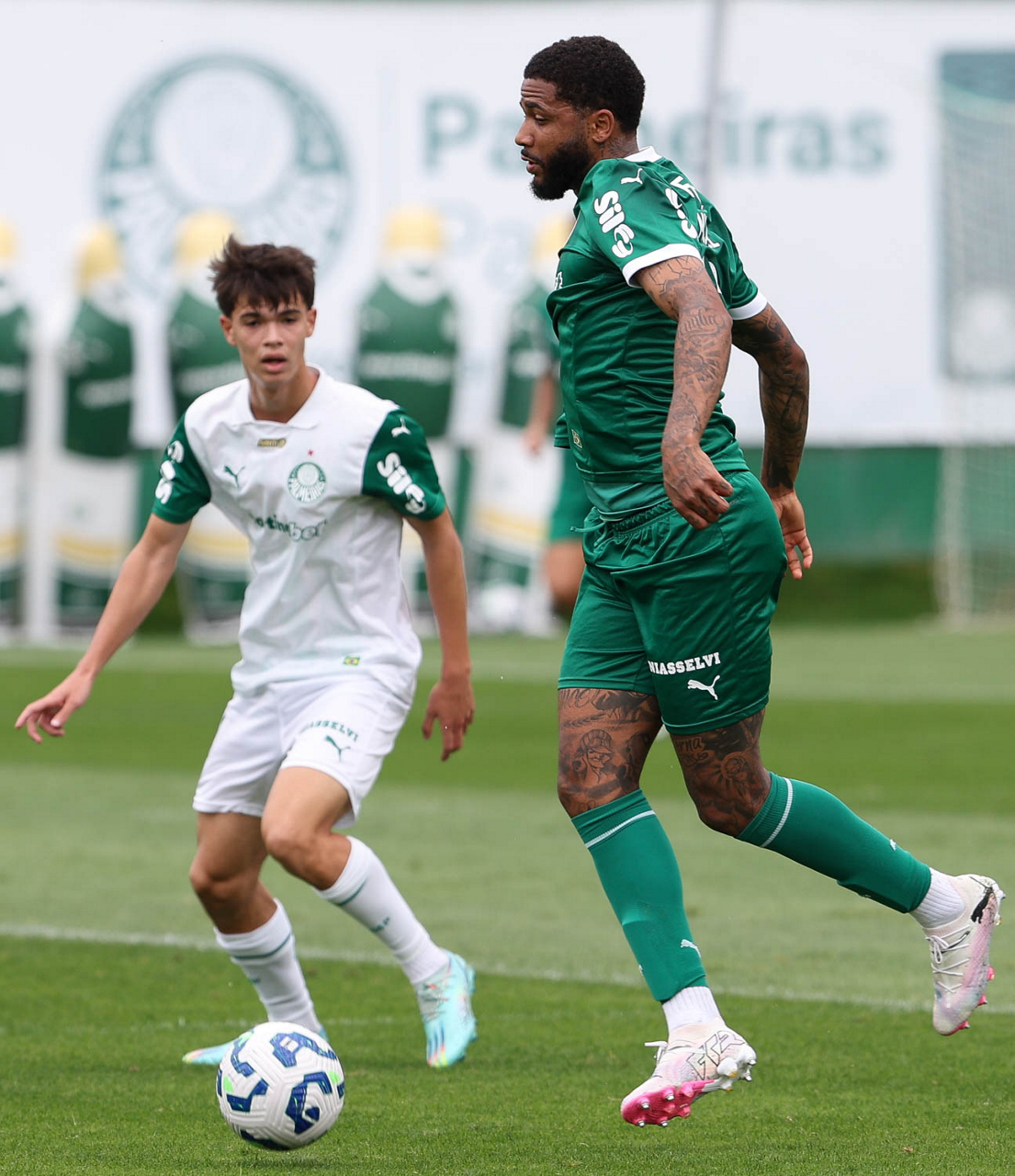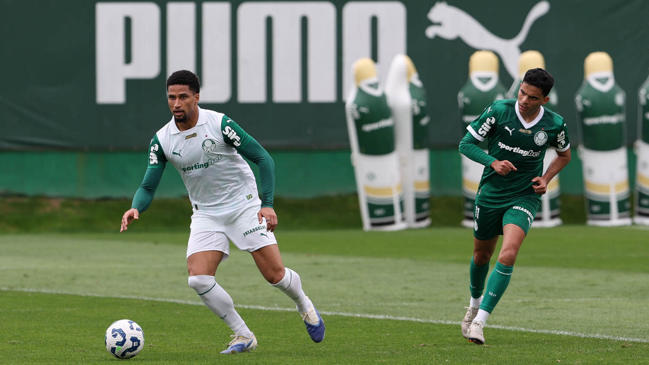 Os jogadores Vitor Roque e Khellven (D), da SE Palmeiras, durante treinamento, na Academia de Futebol. (Foto: Cesar Greco/Palmeiras/by Canon)