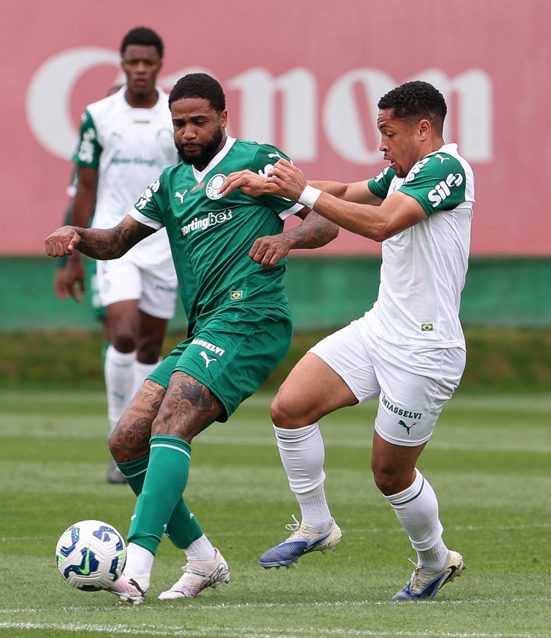 Os jogadores Micael e Vitor Roque (D), da SE Palmeiras, durante treinamento, na Academia de Futebol. (Foto: Cesar Greco/Palmeiras/by Canon)