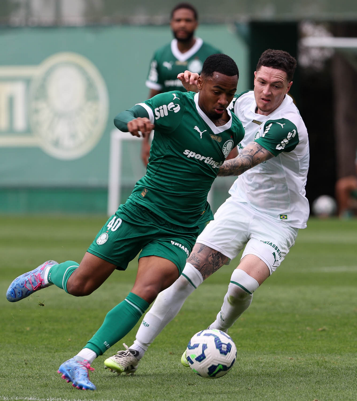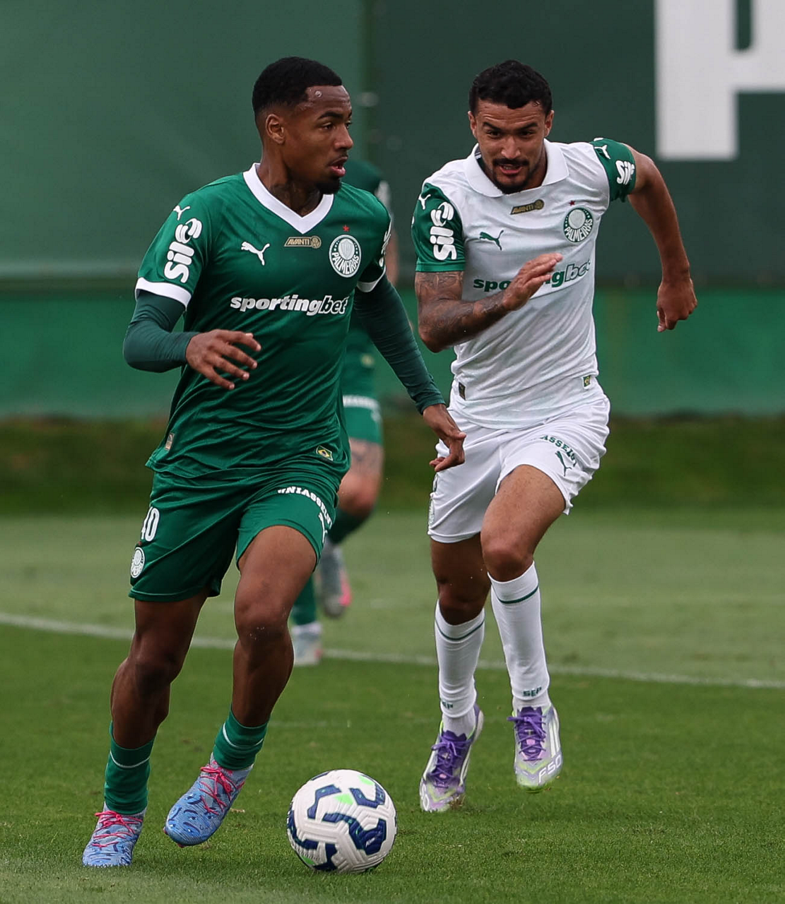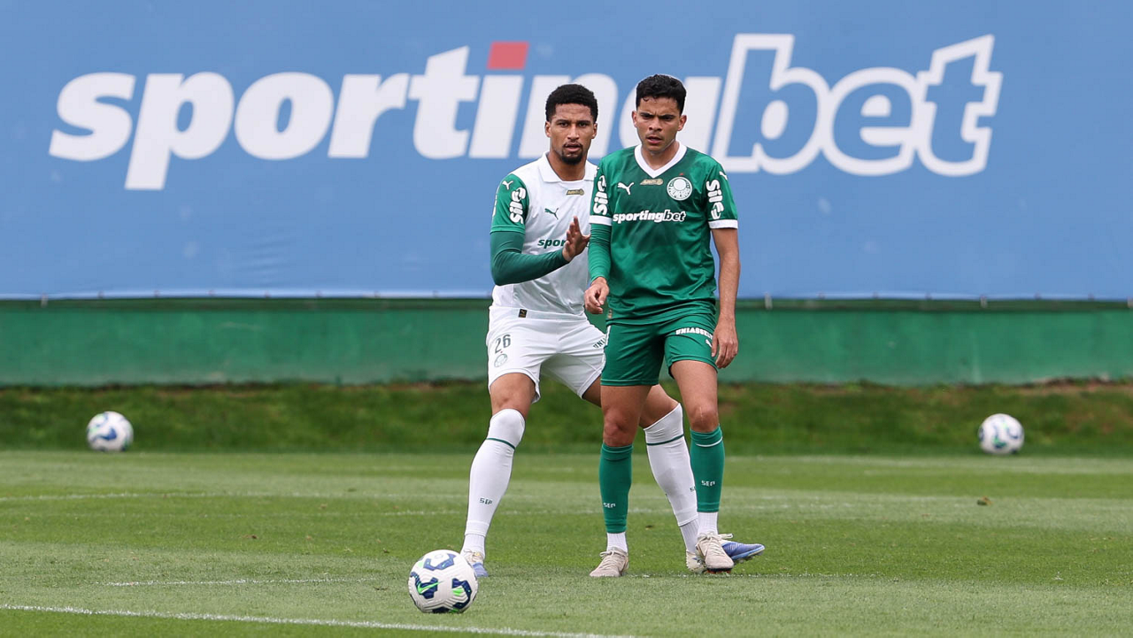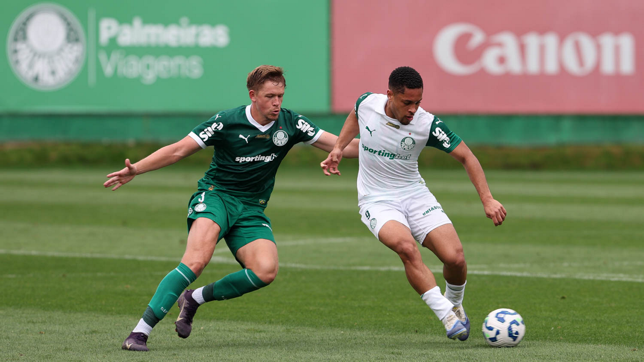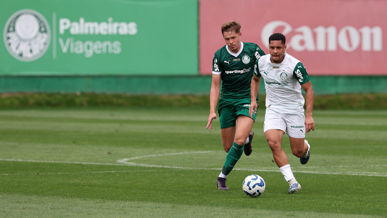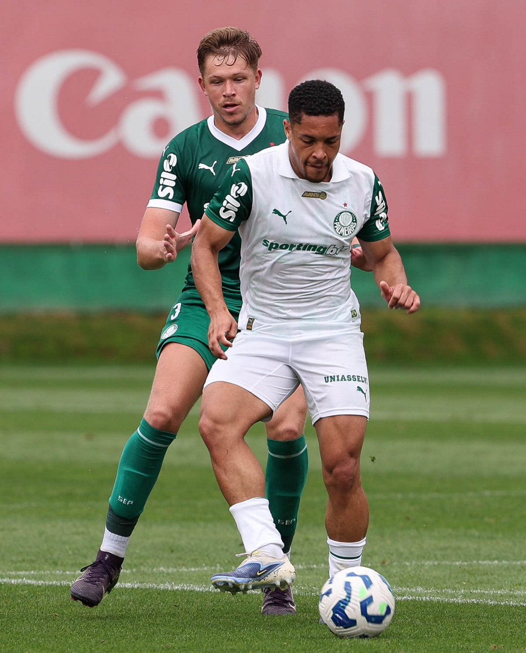 Os jogadores Lucas Evangelista e Vitor Roque (D), da SE Palmeiras, durante treinamento, na Academia de Futebol. (Foto: Cesar Greco/Palmeiras/by Canon)