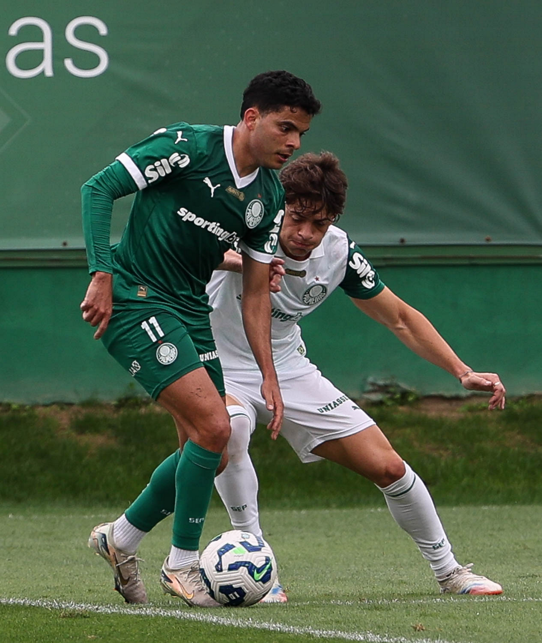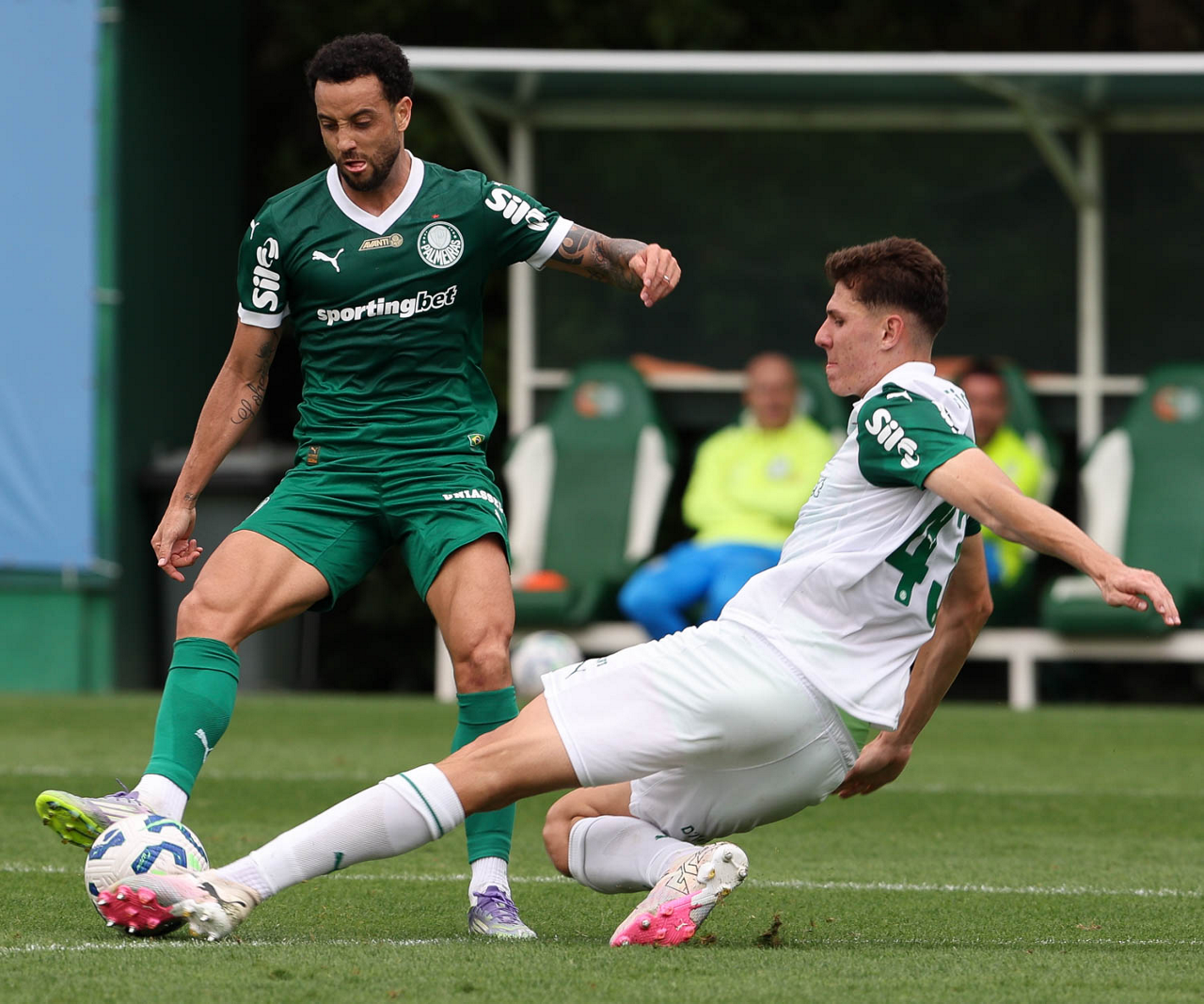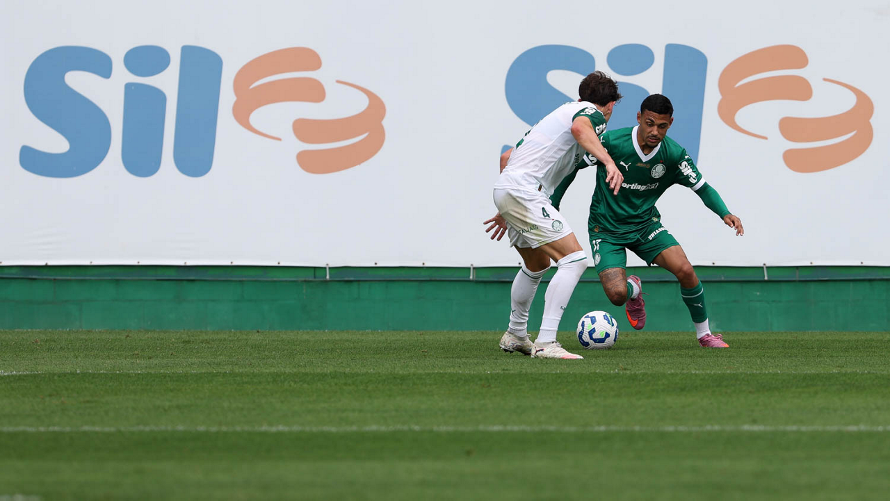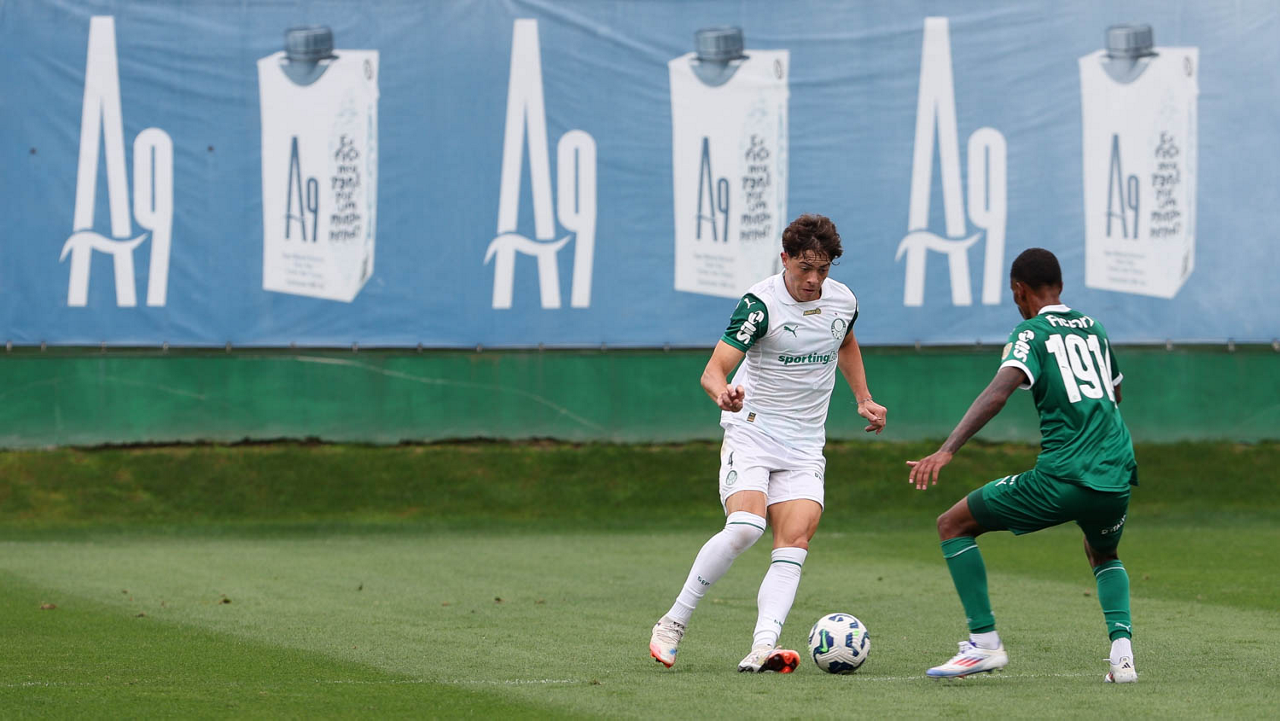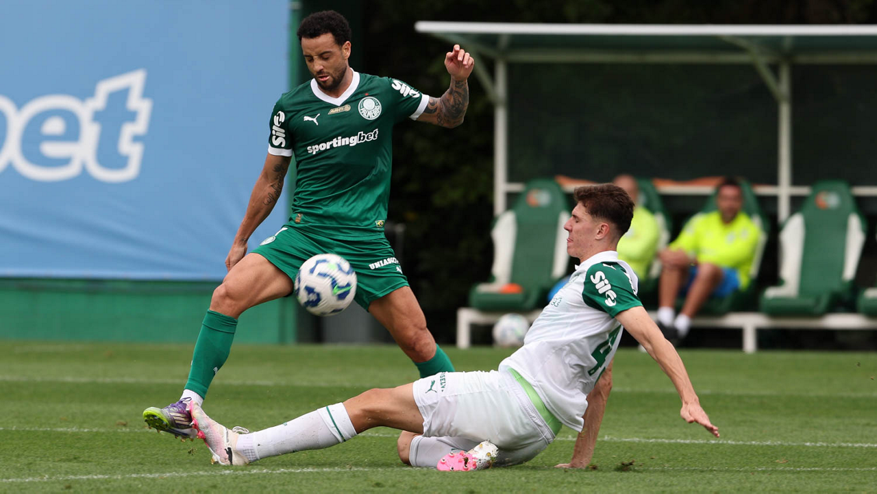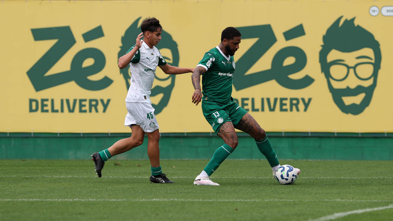 Os jogadores Lucas Evangelista e Vitor Roque (D), da SE Palmeiras, durante treinamento, na Academia de Futebol. (Foto: Cesar Greco/Palmeiras/by Canon)