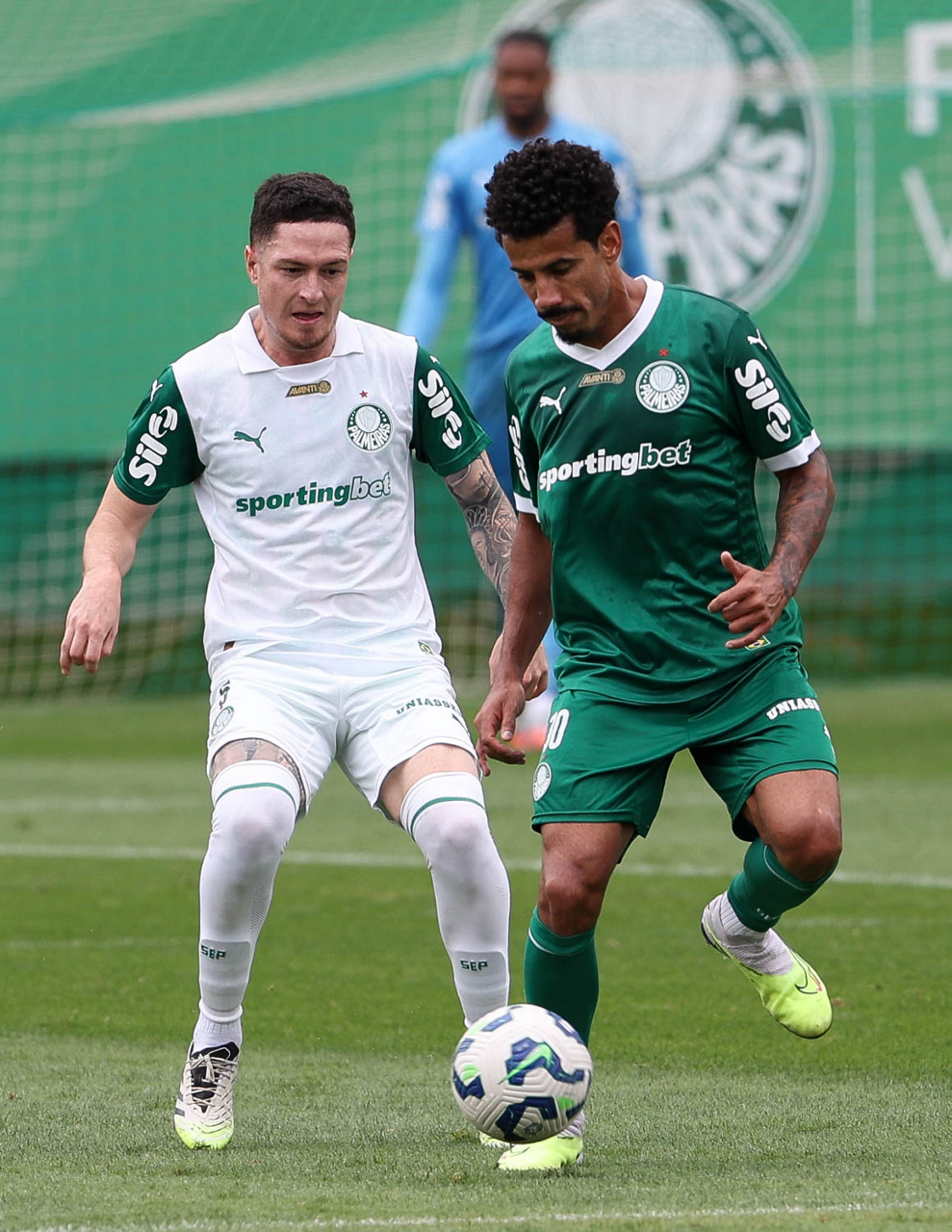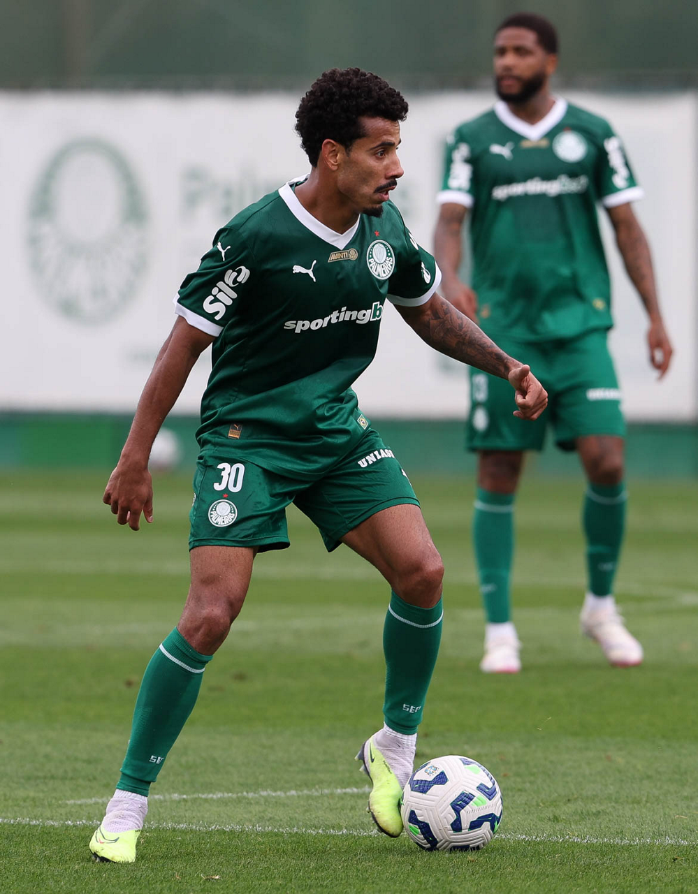 Os jogadores Lucas Evangelista e Anibal Moreno (D), da SE Palmeiras, durante treinamento, na Academia de Futebol. (Foto: Cesar Greco/Palmeiras/by Canon)