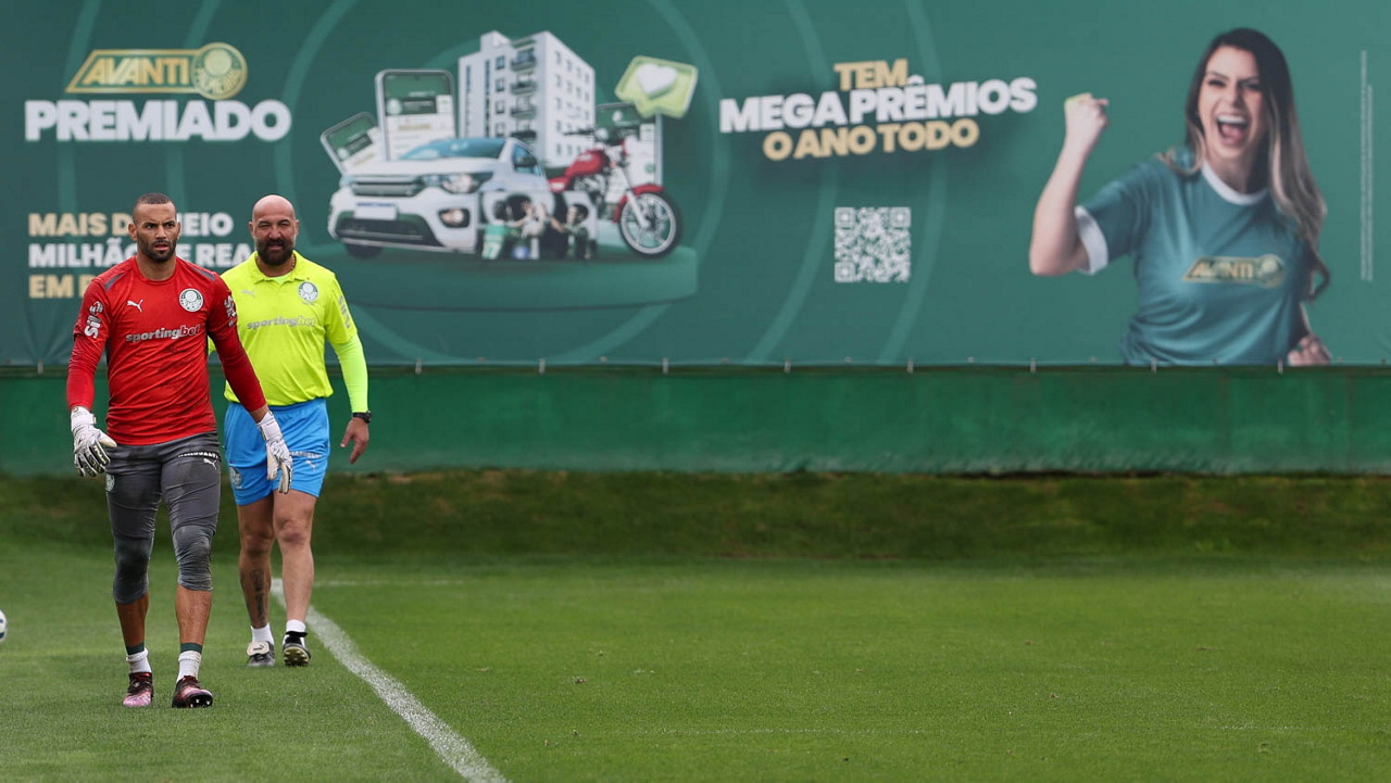 O goleiro Weverton e o preparador de goleiro Rogerio Godoy (D), da SE Palmeiras, durante treinamento, na Academia de Futebol. (Foto: Cesar Greco/Palmeiras/by Canon)