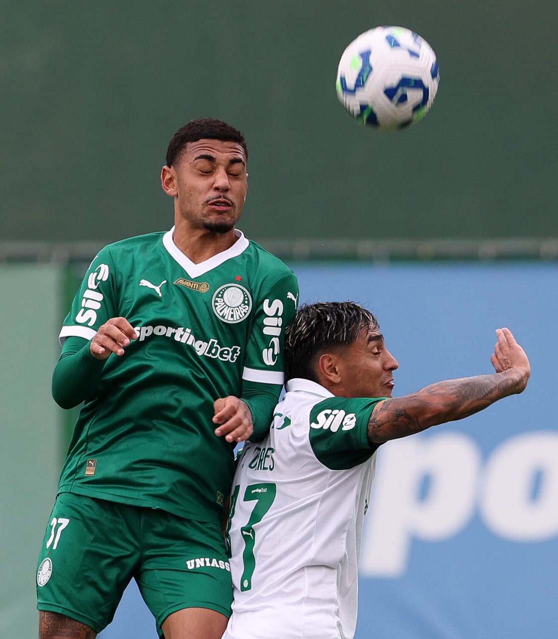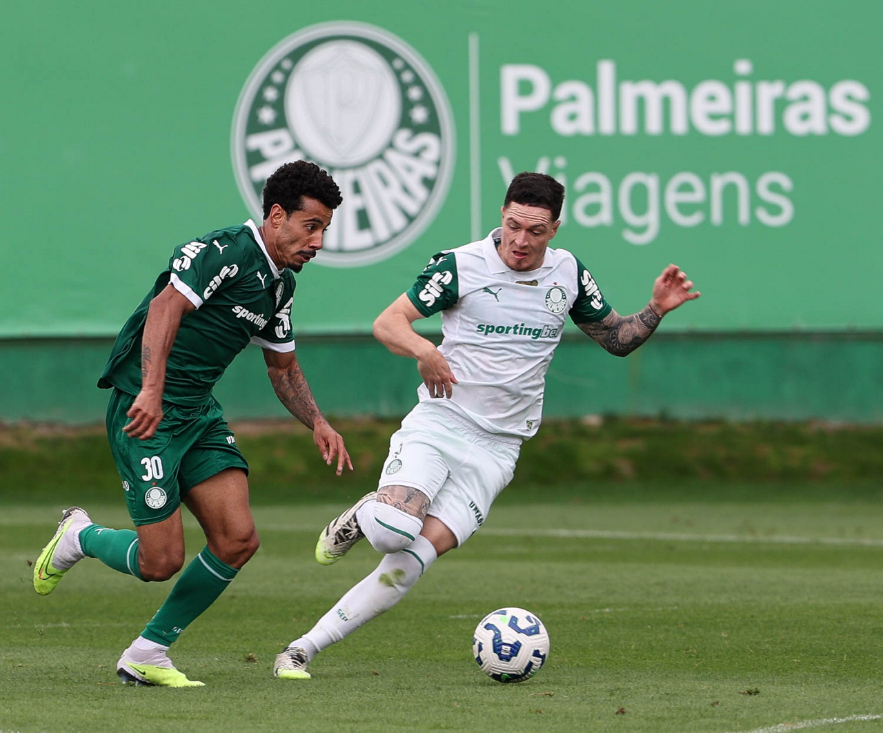 Os jogadores Allan e Jefté (D), da SE Palmeiras, durante treinamento, na Academia de Futebol. (Foto: Cesar Greco/Palmeiras/by Canon)