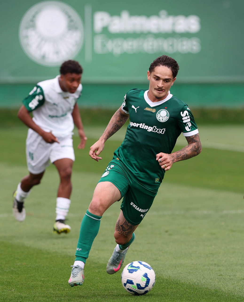 Os jogadores Bruno Fuchs e Vitor Roque (D), da SE Palmeiras, durante treinamento, na Academia de Futebol. (Foto: Cesar Greco/Palmeiras/by Canon)