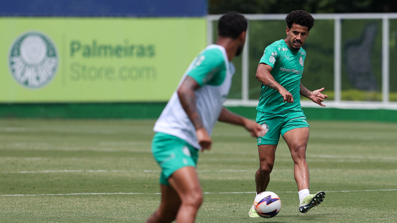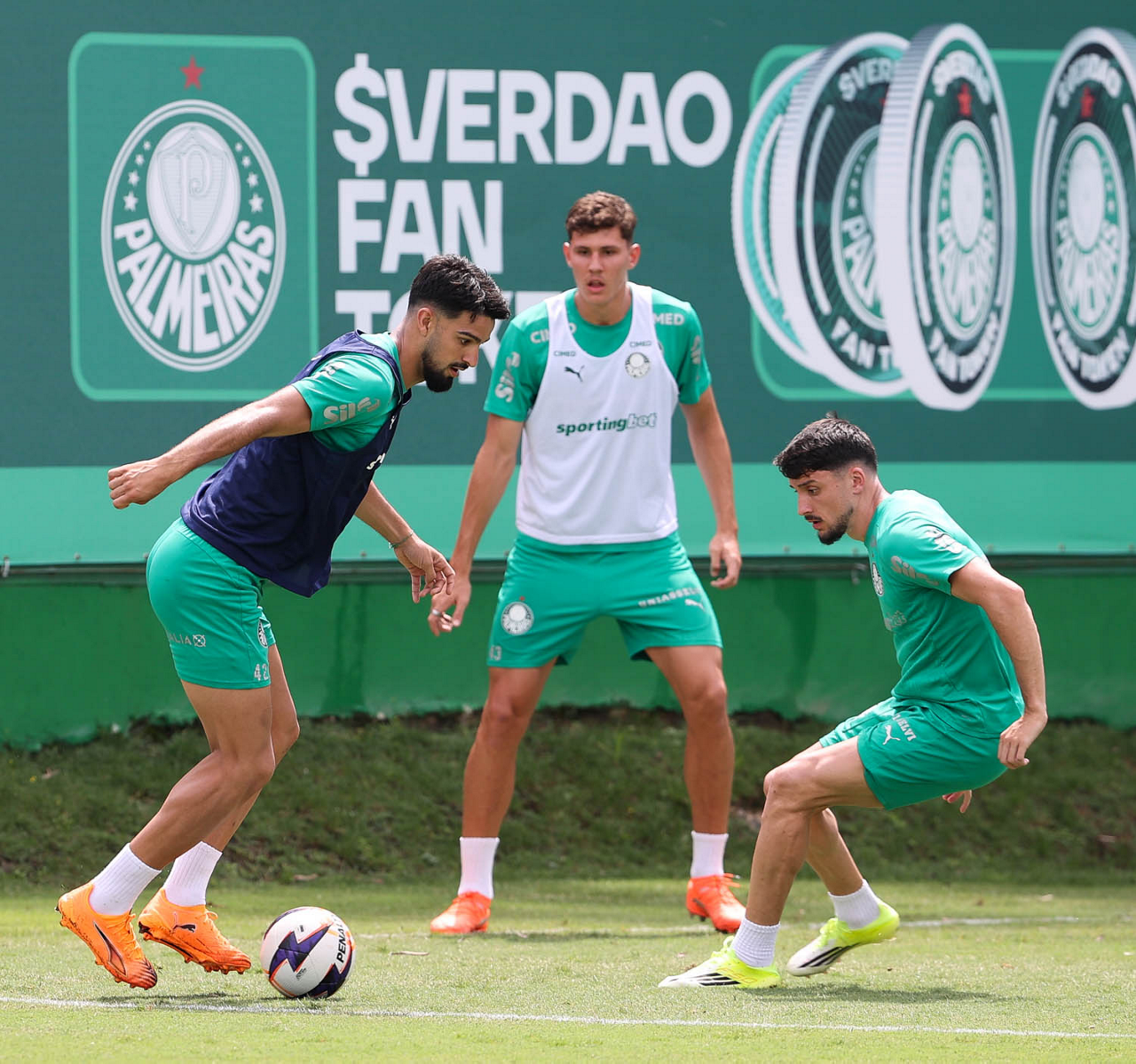 Os jogadores Gustavo Gómez e Riquelme (D), da SE Palmeiras, durante treinamento, na Academia de Futebol. (Foto: Cesar Greco/Palmeiras/by Canon)