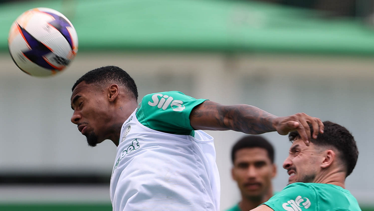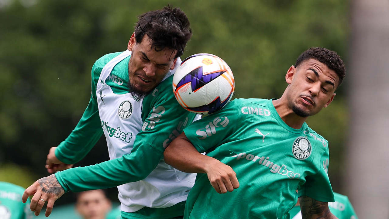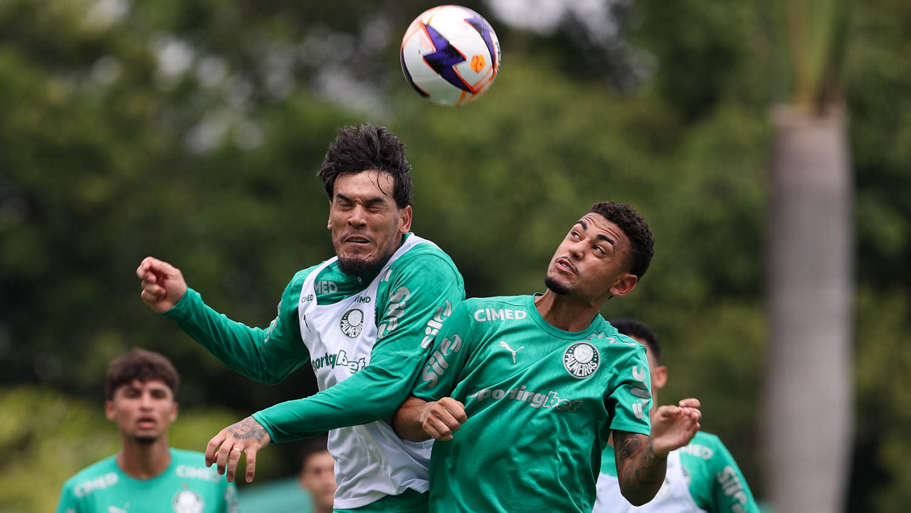 Os jogadores Gustavo Gómez e Larson (D), da SE Palmeiras, durante treinamento, na Academia de Futebol. (Foto: Cesar Greco/Palmeiras/by Canon)