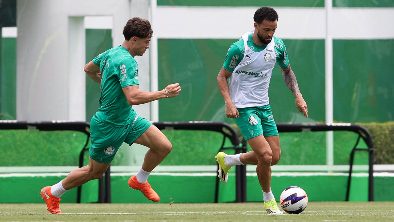 Os jogadores Agustín Giay e Felipe Anderson (D), da SE Palmeiras, durante treinamento, na Academia de Futebol. (Foto: Cesar Greco/Palmeiras/by Canon)