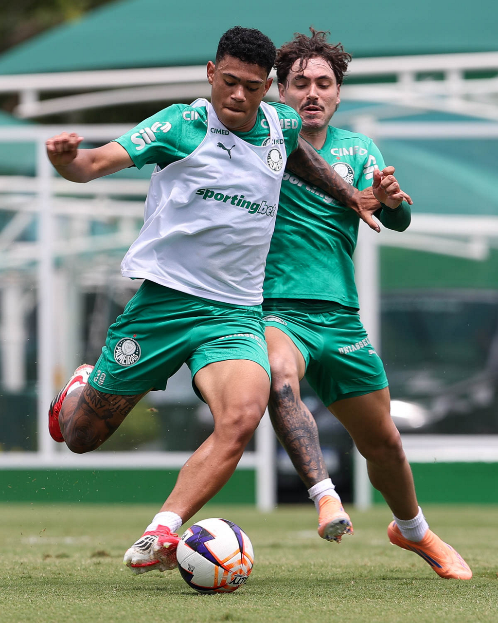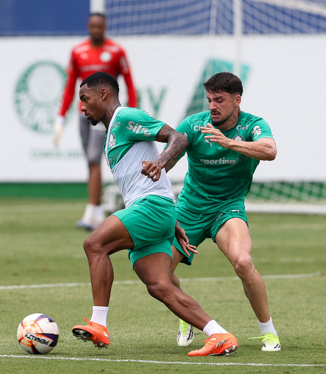 Os jogadores Allan e Joaquín Piquerez (D), da SE Palmeiras, durante treinamento, na Academia de Futebol. (Foto: Cesar Greco/Palmeiras/by Canon)