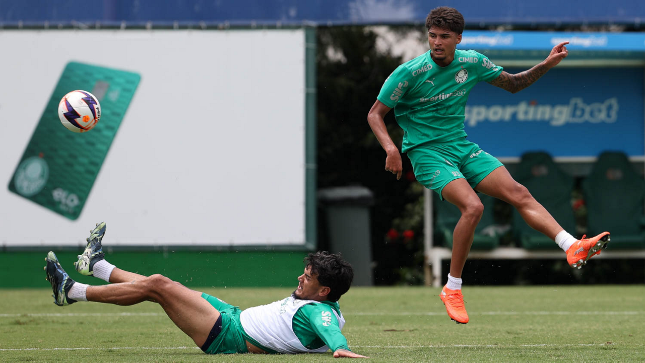 Os jogadores Gustavo Gómez e Luighi (D), da SE Palmeiras, durante treinamento, na Academia de Futebol. (Foto: Cesar Greco/Palmeiras/by Canon)
