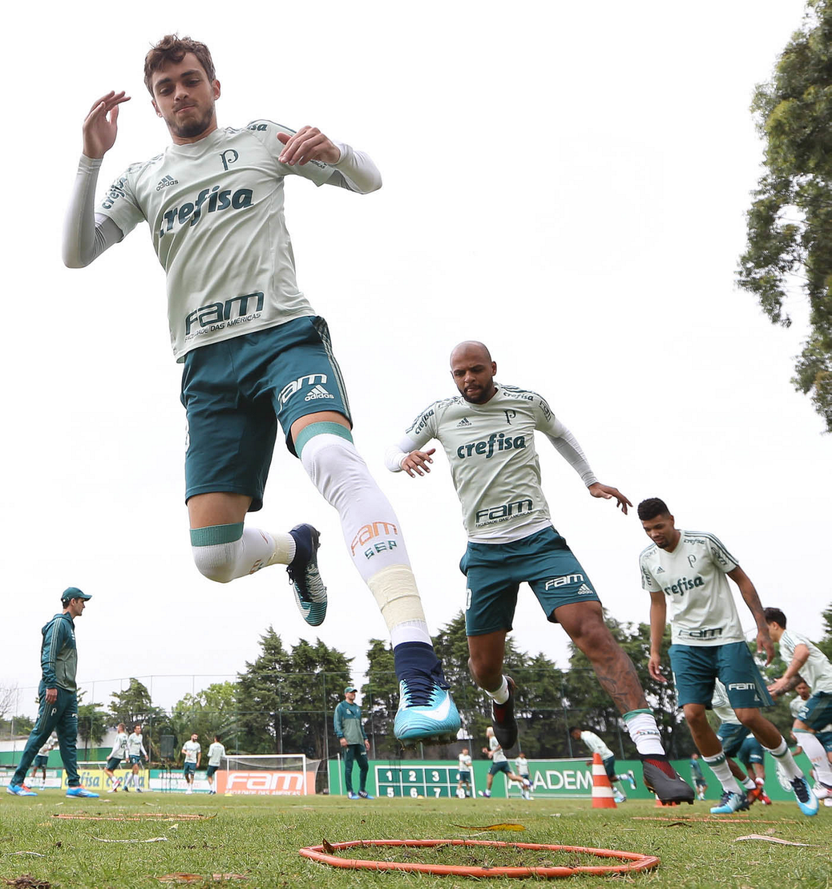 Os jogadores Tchê Tchê e Hyoran (D), da SE Palmeiras, durante treinamento, na Academia de Futebol.