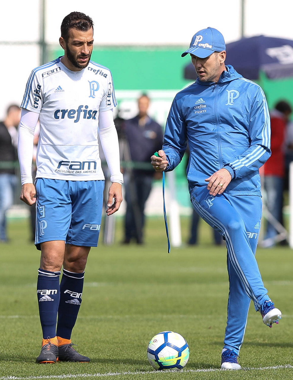 O jogador Edu Dracena e o auxiliar técnico Paulo Turra (D), da SE Palmeiras, durante treinamento, na Academia de Futebol.