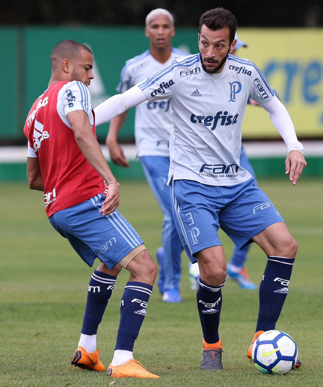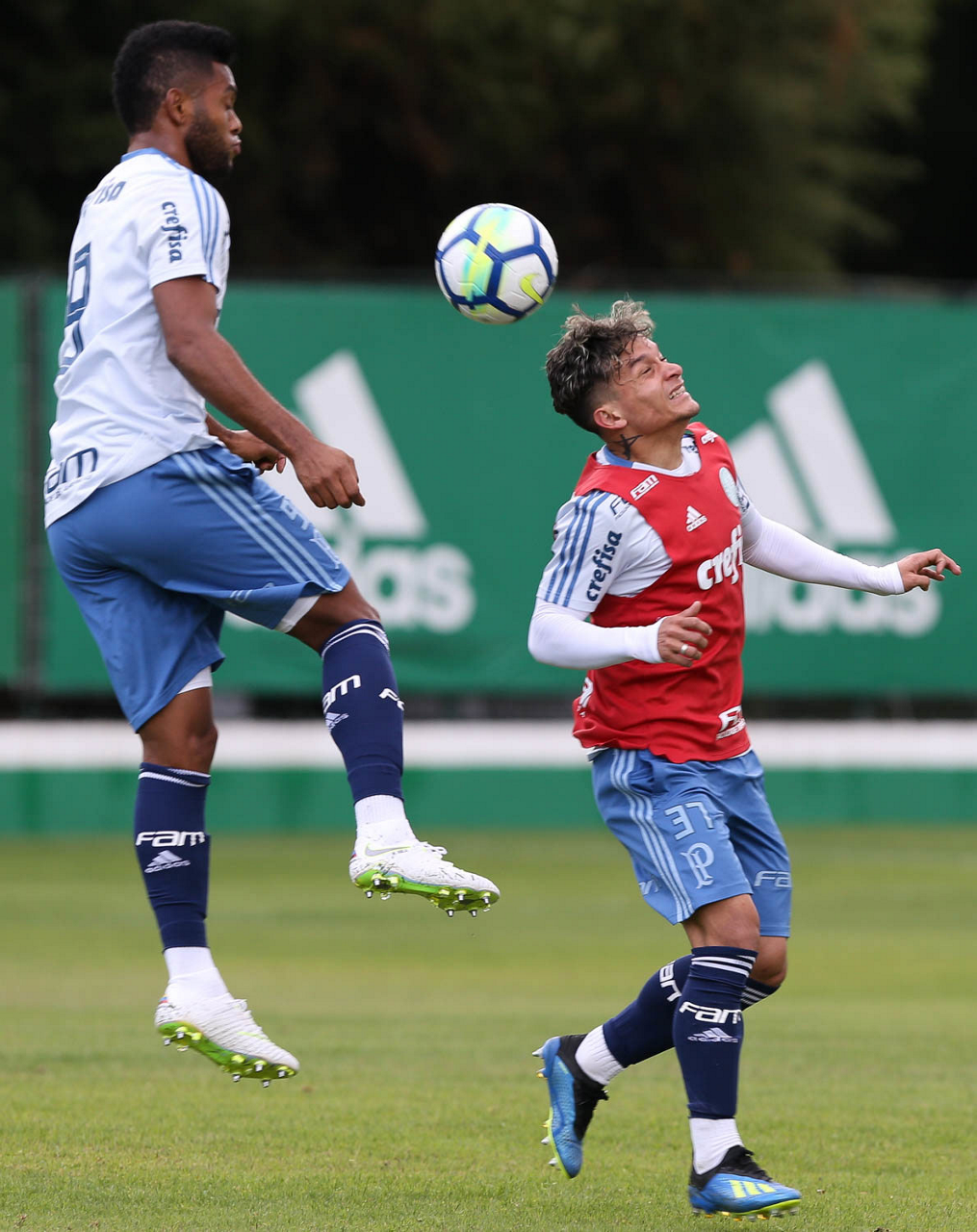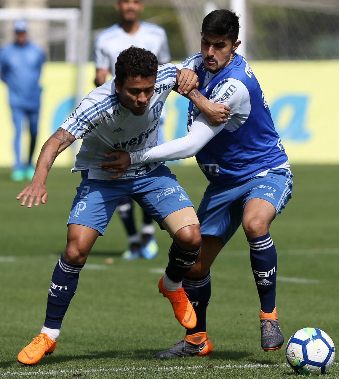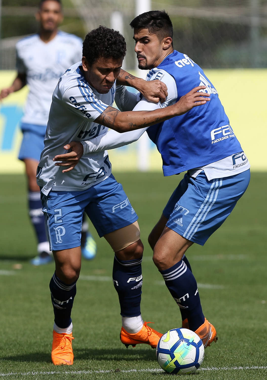 Os jogadores Deyverson e Victor Luis (D), da SE Palmeiras, durante treinamento, na Academia de Futebol.