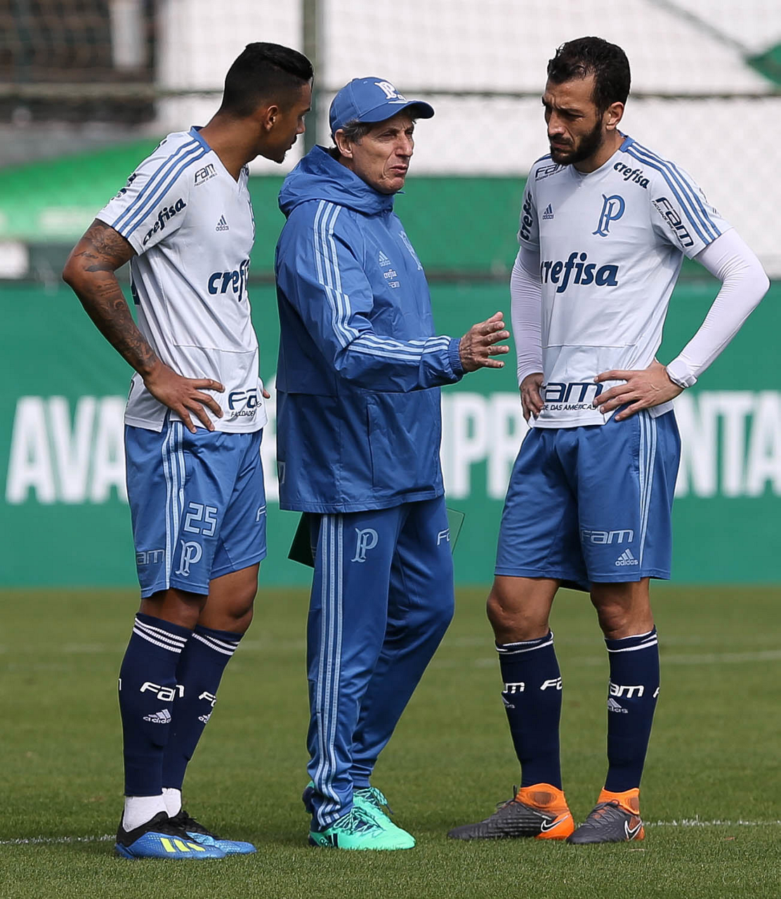 Os jogadores Antonio Carlos e Edu Dracena (E e D) e o auxilar técnico Carlos Pracidelli (C), da SE Palmeiras, durante treinamento, na Academia de Futebol.