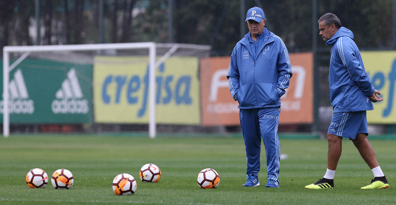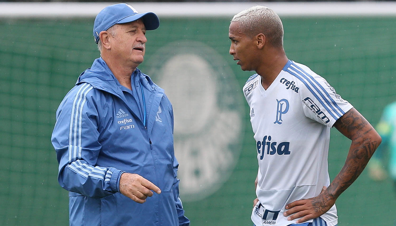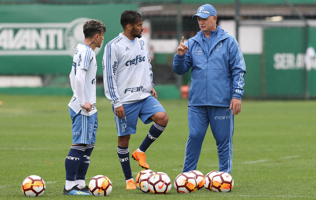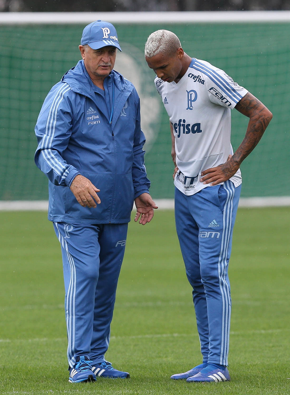 O técnico Felipão e o jogador Deyverson (D), da SE Palmeiras, durante treinamento, na Academia de Futebol.