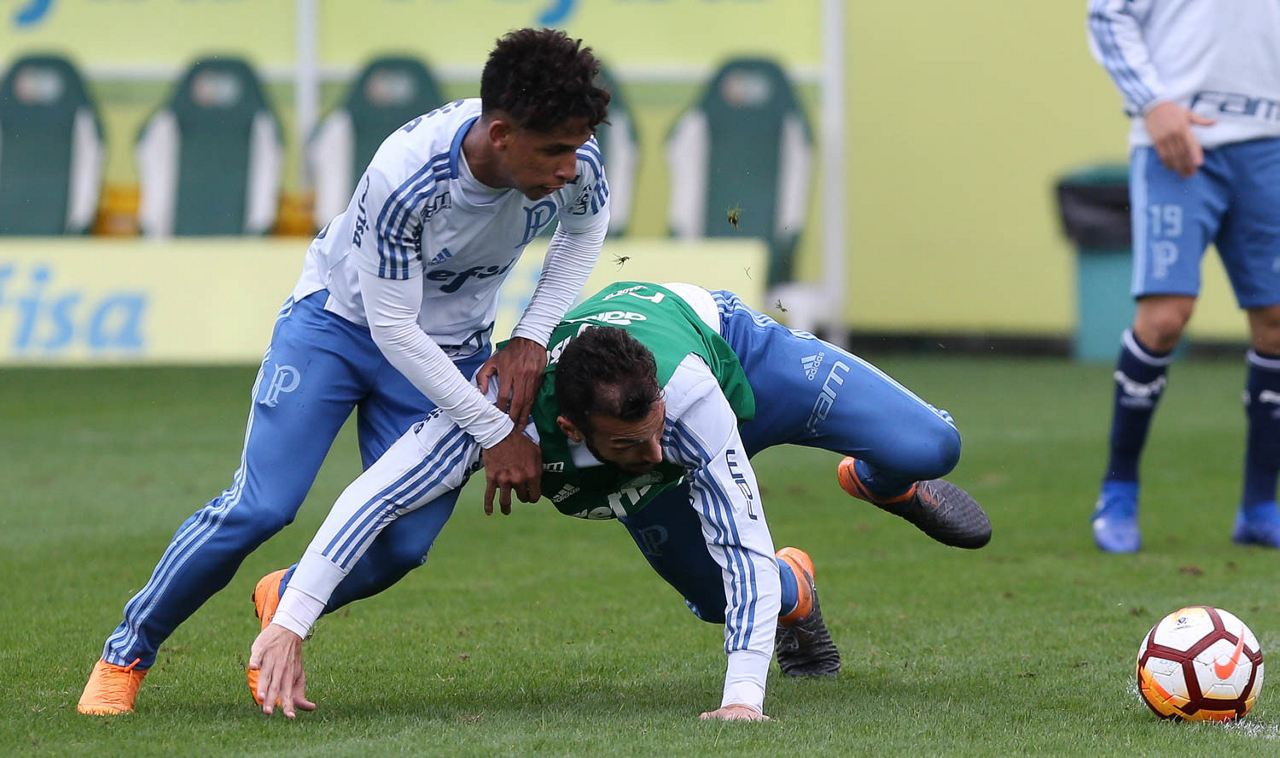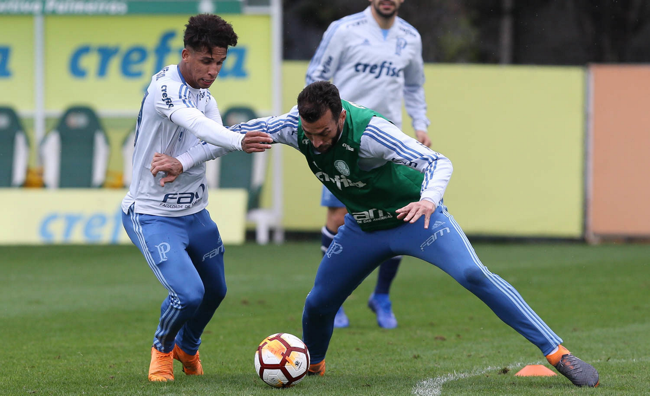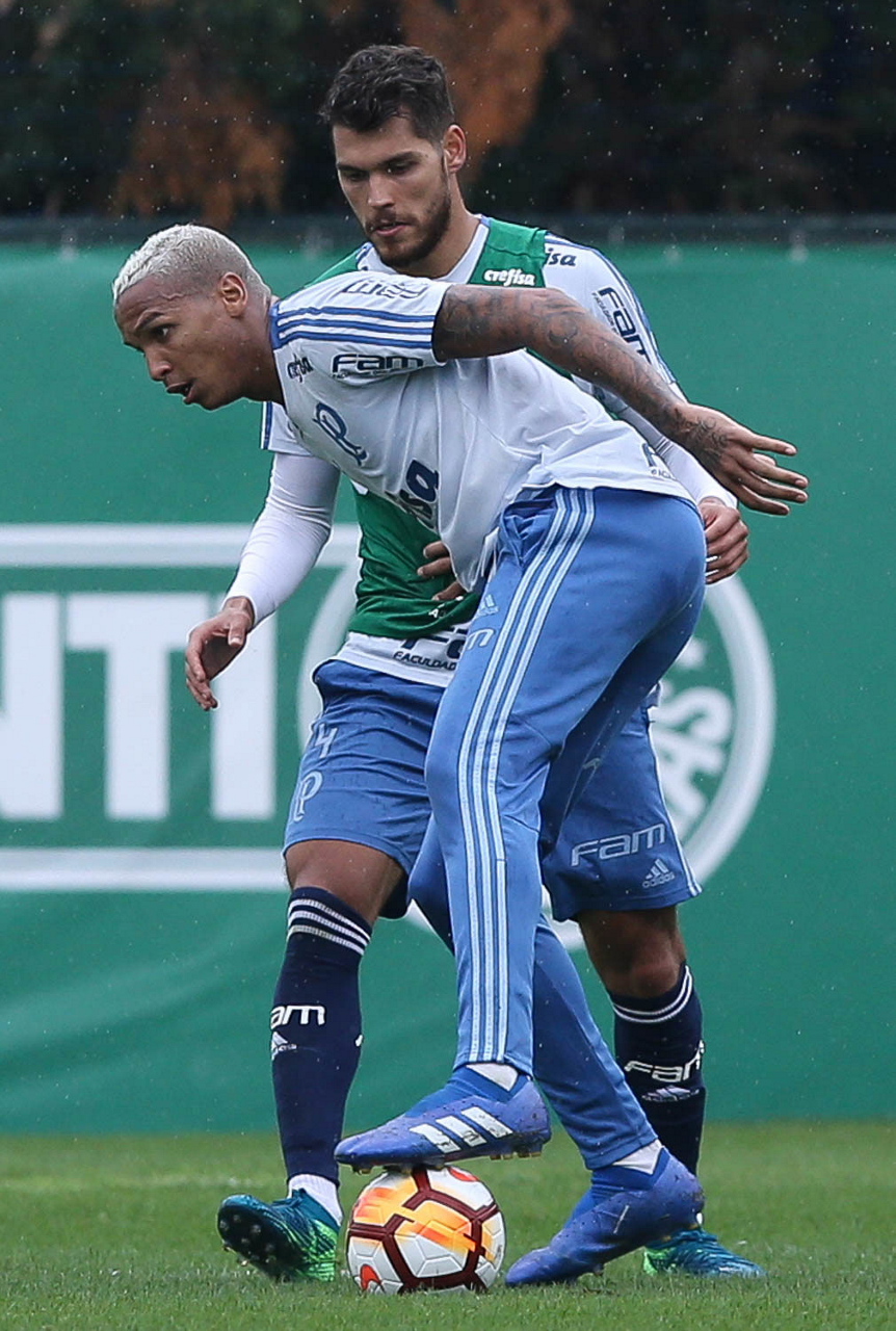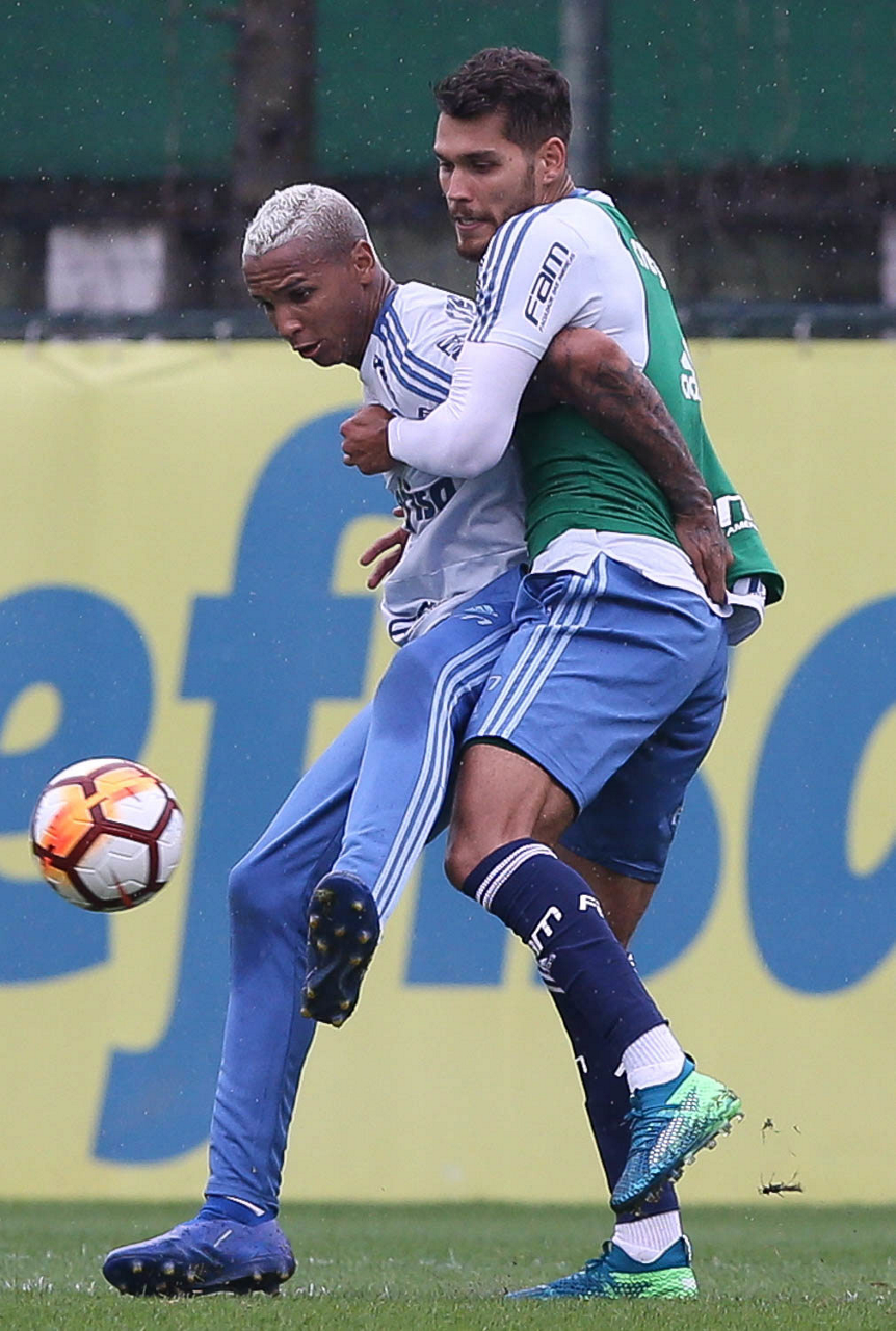Os jogadores Nico Freire e Deyverson (D), da SE Palmeiras, durante treinamento, na Academia de Futebol.