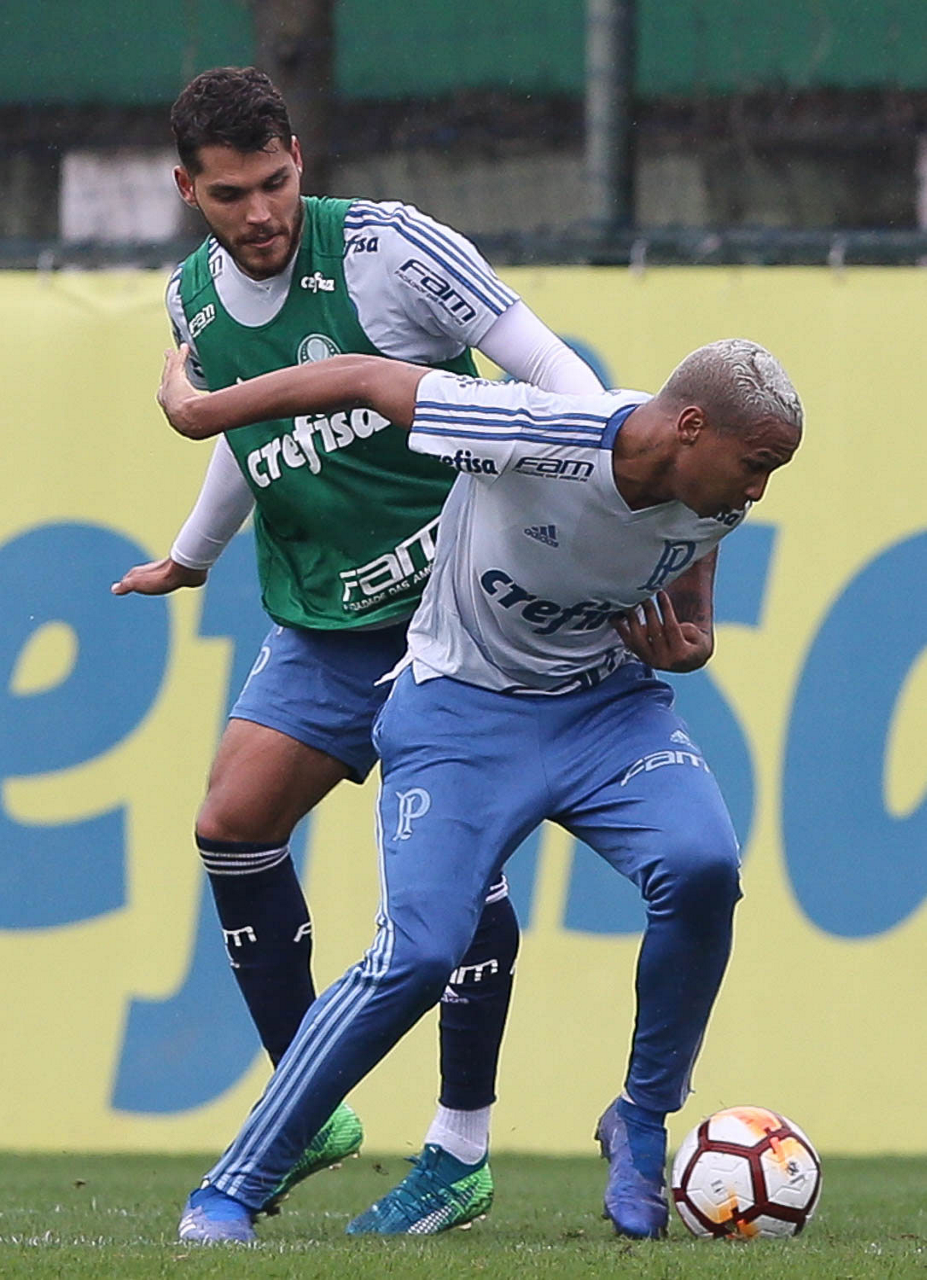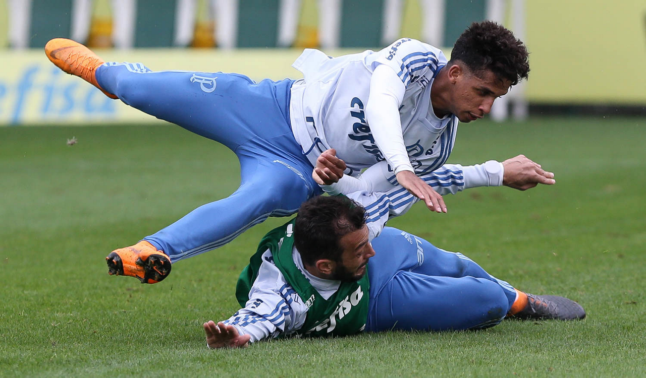 Os jogadores Deyverson e Nico Freire (D), da SE Palmeiras, durante treinamento, na Academia de Futebol.