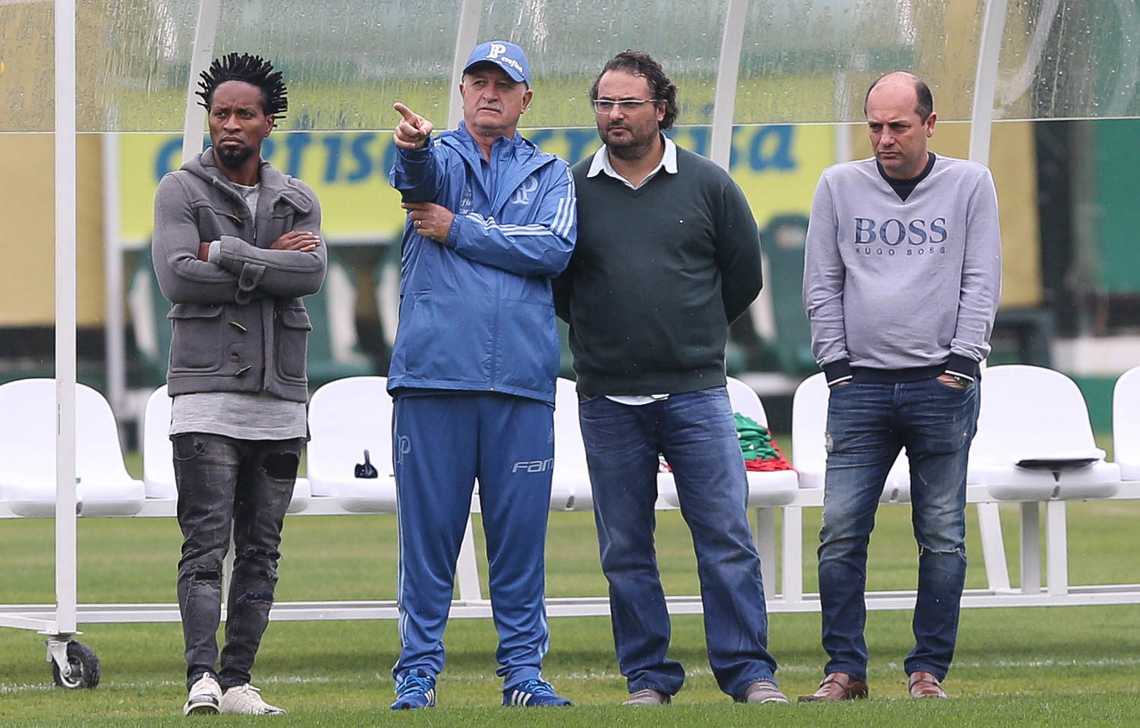 O assessor técnico Zé Roberto, o técnico Felipão, o diretor de futebol Alexandre Mattos e o gerente de futebol Cicero Souza (E/D), da SE Palmeiras, durante treinamento, na Academia de Futebol.