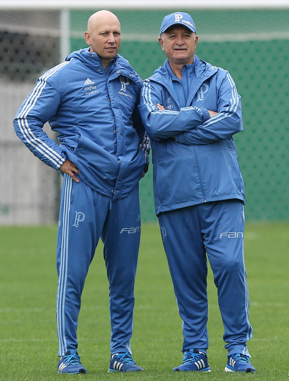 O técnico Felipão e o preparador físico Omar Feitosa (E), da SE Palmeiras, durante treinamento, na Academia de Futebol.