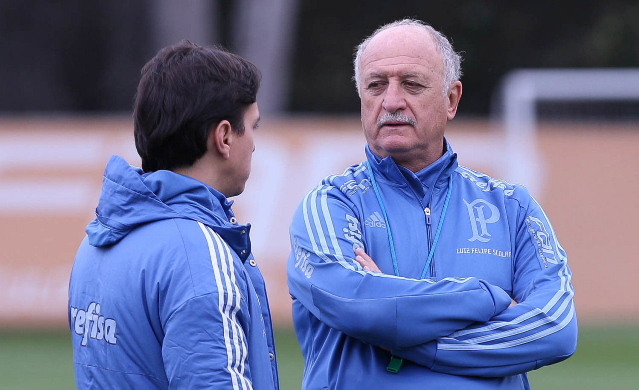 O técnico Felipão e o médico Gustavo Maglioca (E), da SE Palmeiras, durante treinamento, na Academia de Futebol.