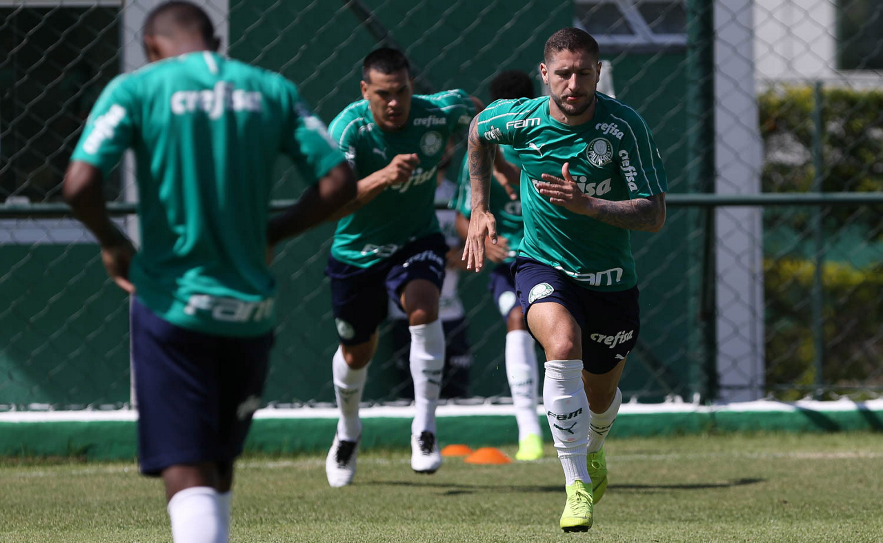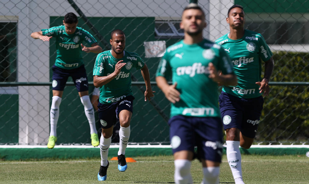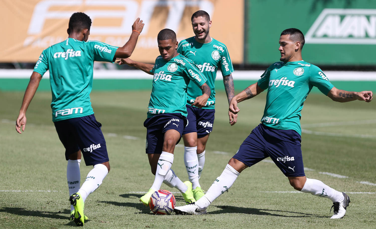 Os jogadores Esteves, Zé Rafael e Gustavo Gómez (E/D), da SE Palmeiras, durante treinamento, na Academia de Futebol.