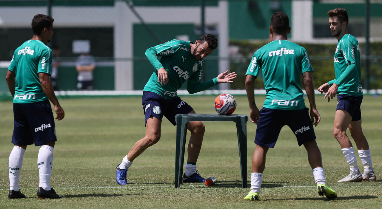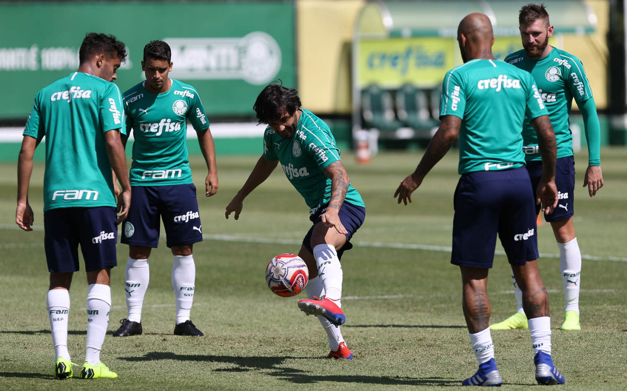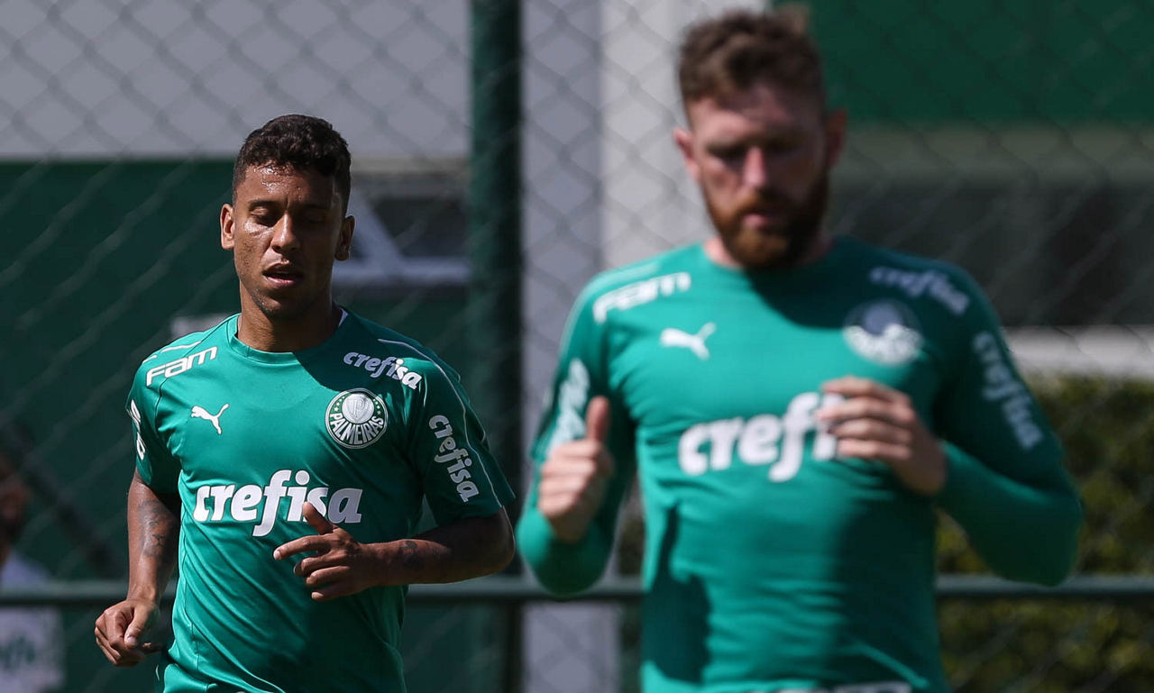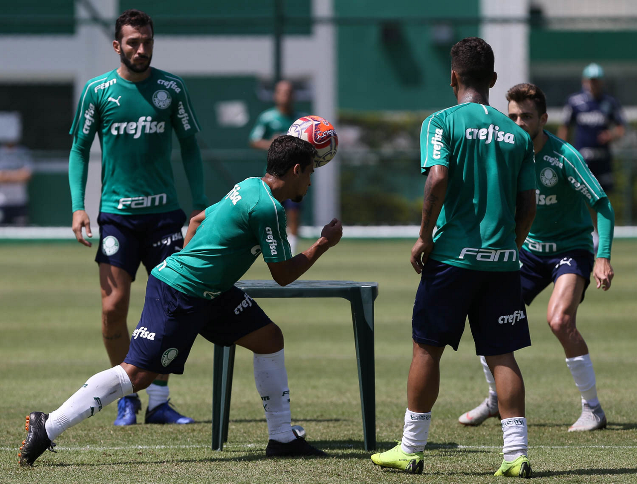 Os jogadores Esteves, Zé Rafael e Gustavo Gómez (E/D), da SE Palmeiras, durante treinamento, na Academia de Futebol.