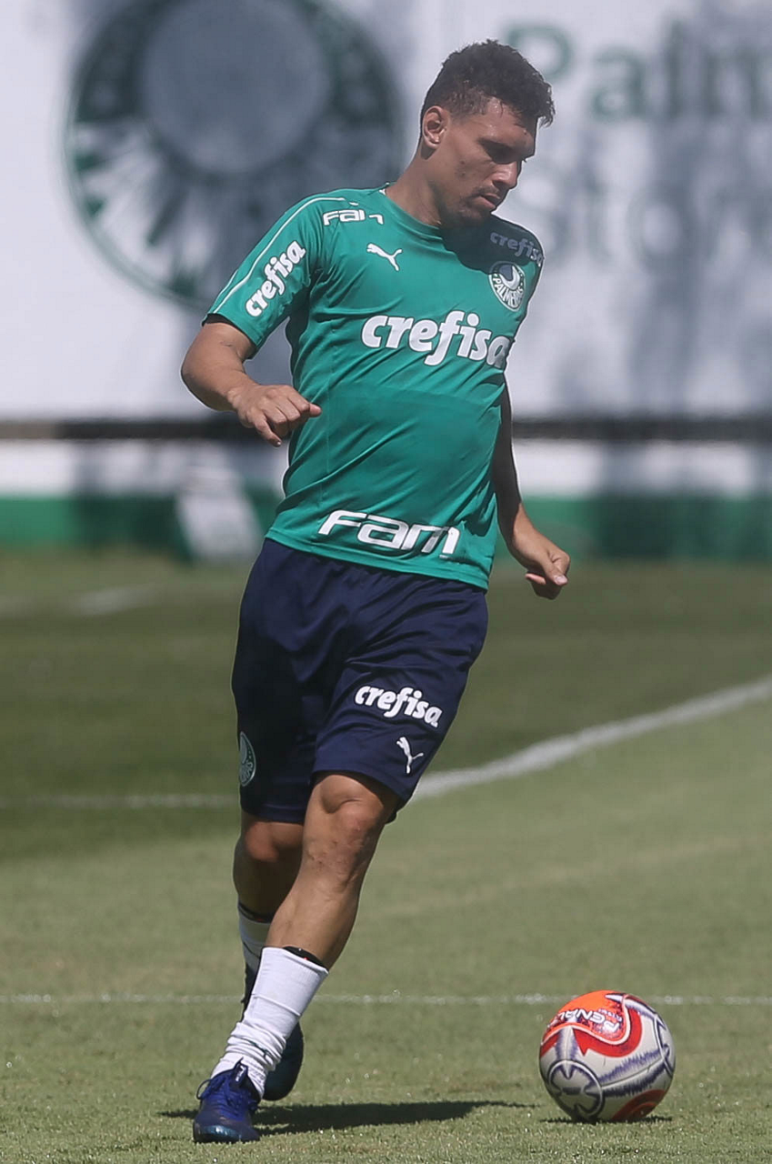 O jogador Thiago Santos, da SE Palmeiras, durante treinamento, na Academia de Futebol.