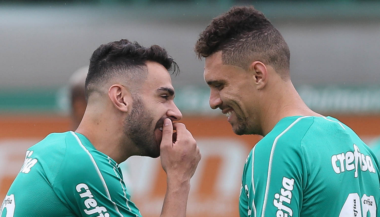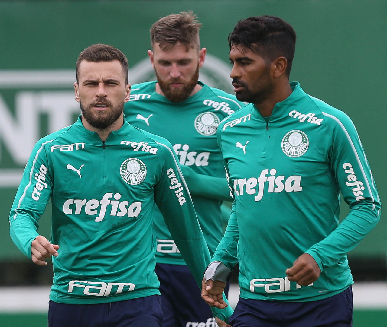 Os jogadores Lucas Lima e Thiago Santos (D), da SE Palmeiras, durante treinamento, na Academia de Futebol.