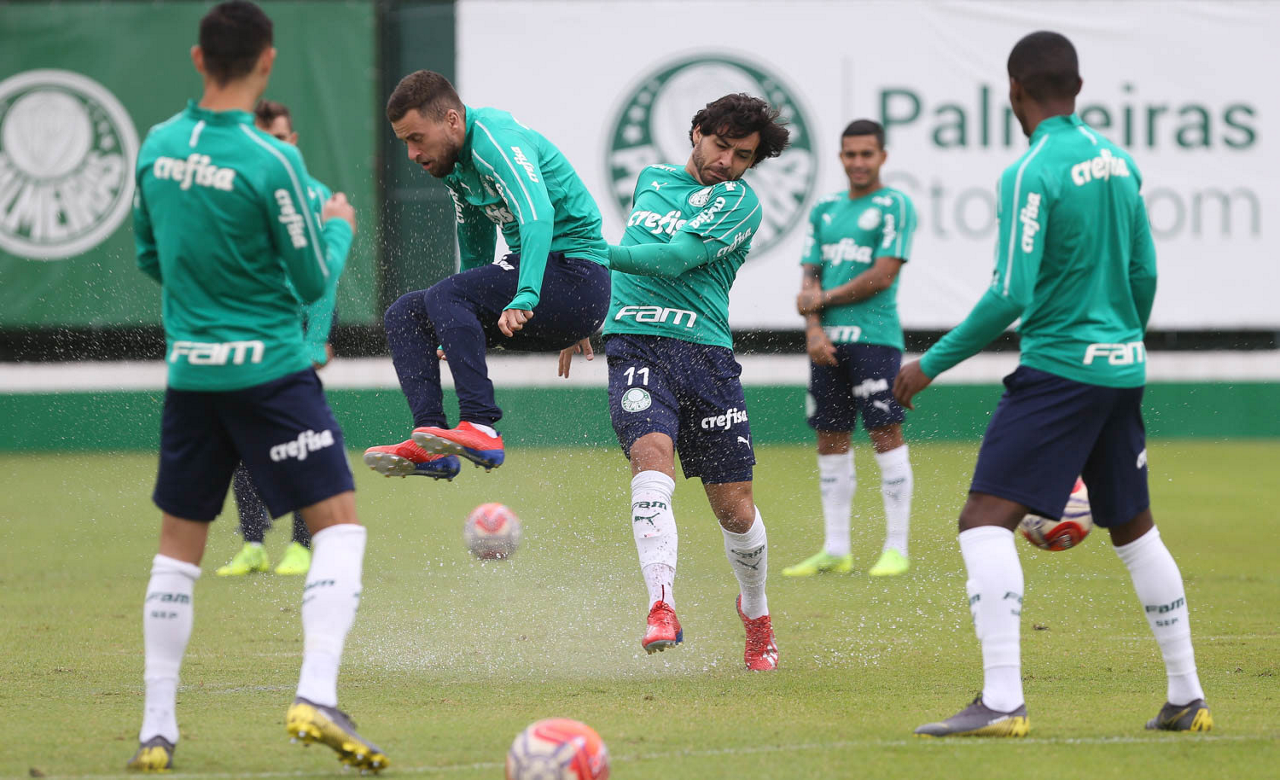 Os jogadores Lucas Lima e Ricardo Goulart (D), da SE Palmeiras, durante treinamento, na Academia de Futebol.
