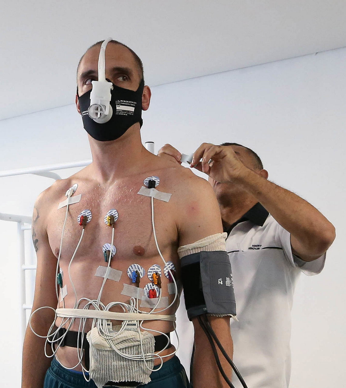 O jogador Emerson Santos e o fisiologista Thiago Santi (D), da SE Palmeiras, durante exames de reapresentação, na Academia de Futebol.