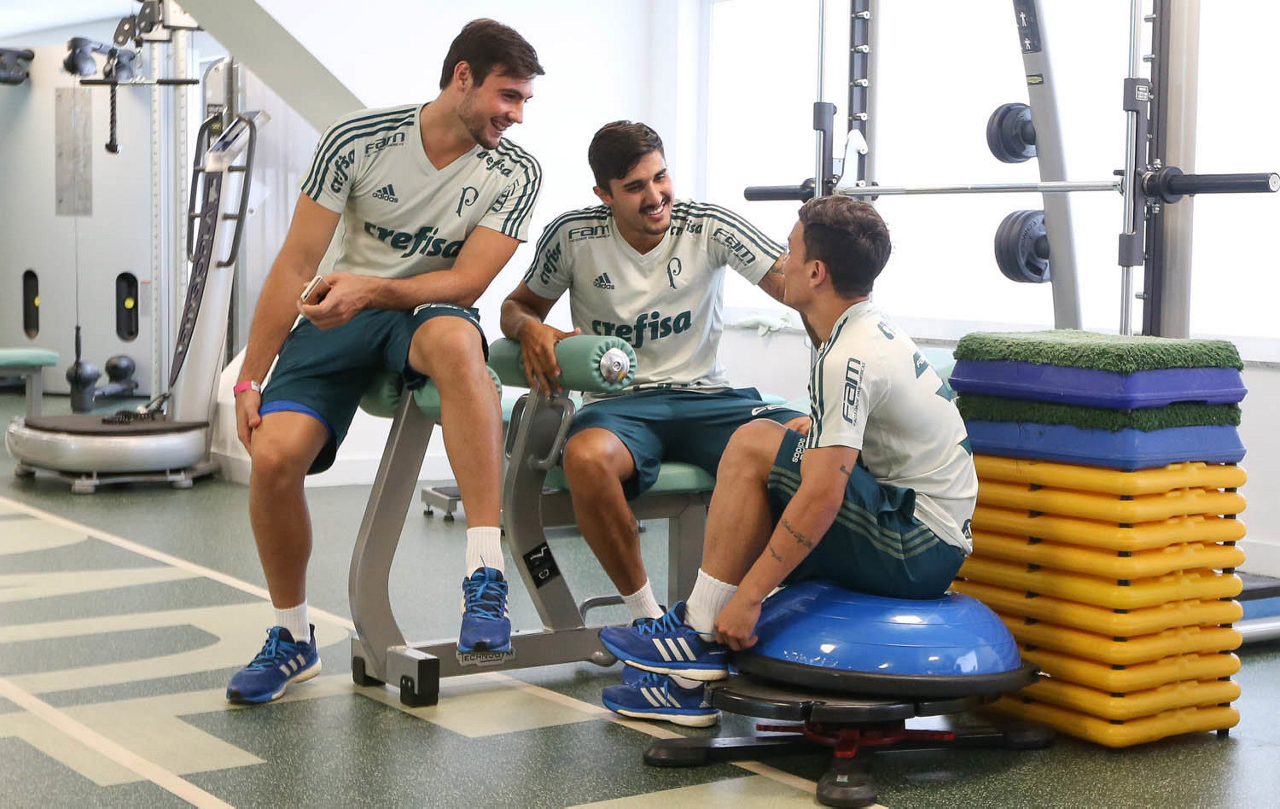 O goleiro Daniel e os jogadores Thiago Martins e Arthur (E/D), da SE Palmeiras, durante exames de reapresentação, na Academia de Futebol.