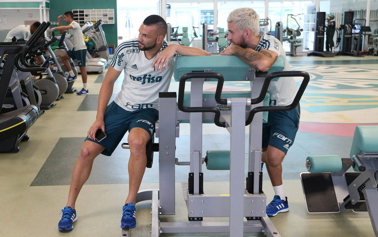 O jogador Jean e o preparador físico Thiago Maldonado (D), da SE Palmeiras, durante exames de reapresentação, na Academia de Futebol.