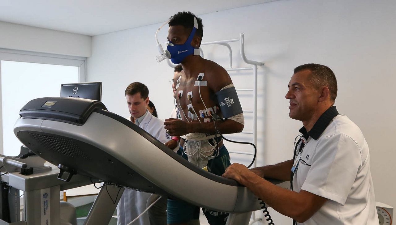 O jogador Emerson Santos, da SE Palmeiras, durante exames de reapresentação, na Academia de Futebol.
