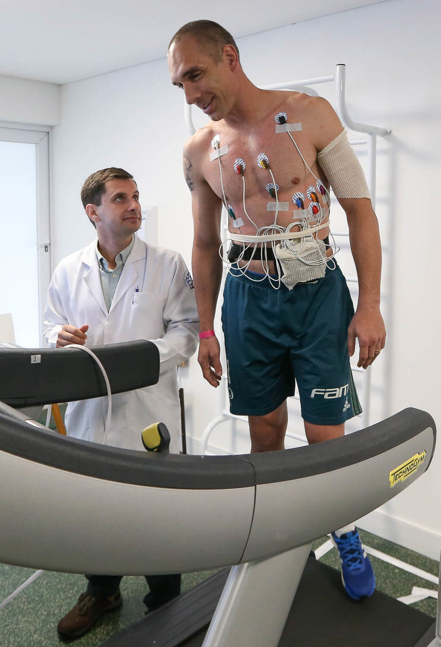 O médico Gilberto e o jogador Juninho (D), da SE Palmeiras, durante exames de reapresentação, na Academia de Futebol.