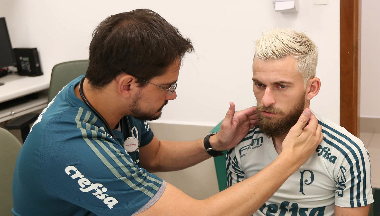 O médico Gilberto e o jogador Lucas Lima (D), da SE Palmeiras, durante exames de reapresentação, na Academia de Futebol.