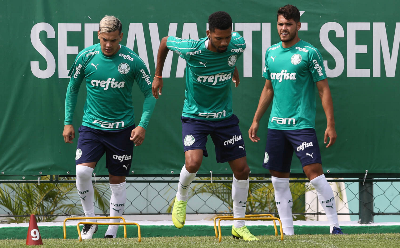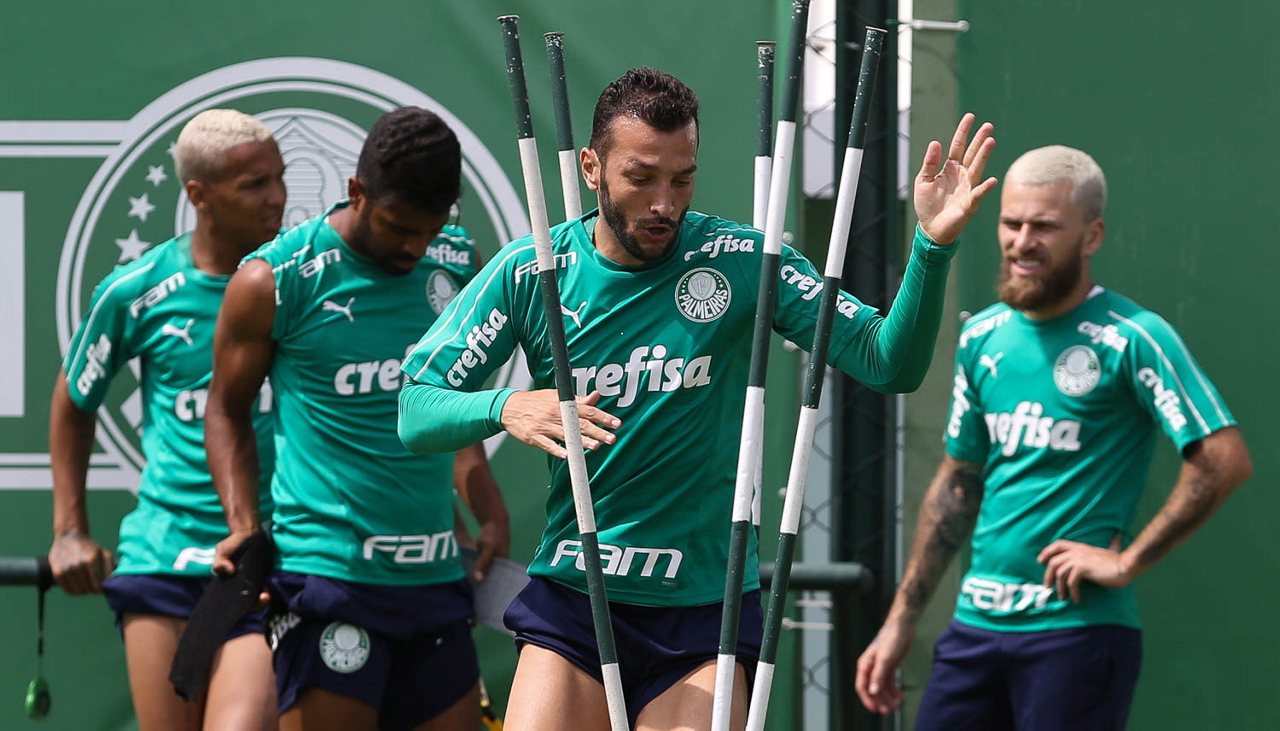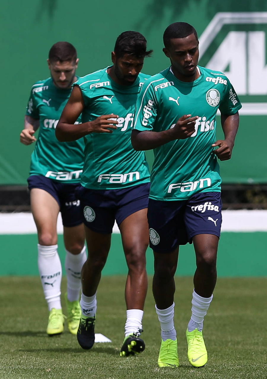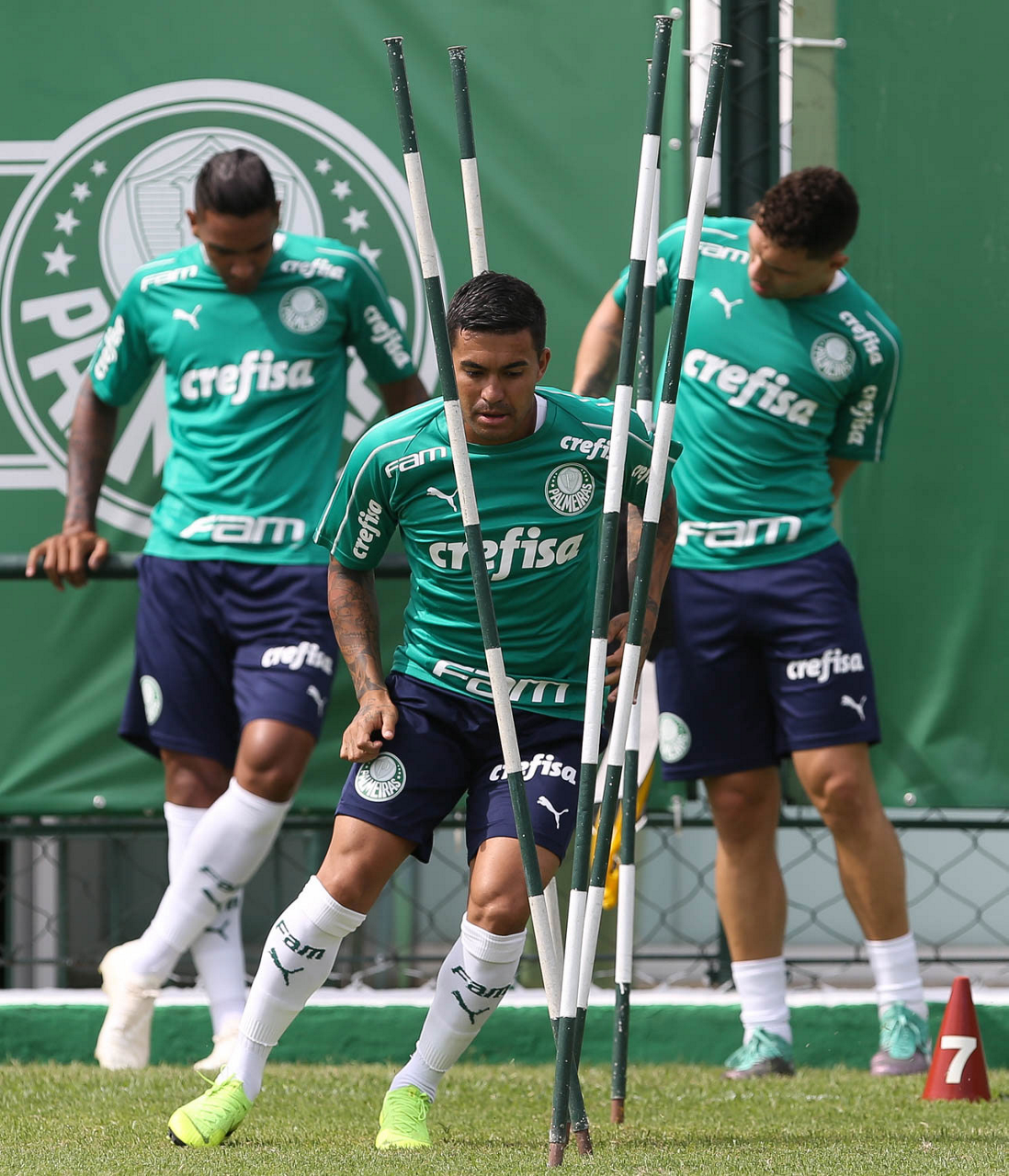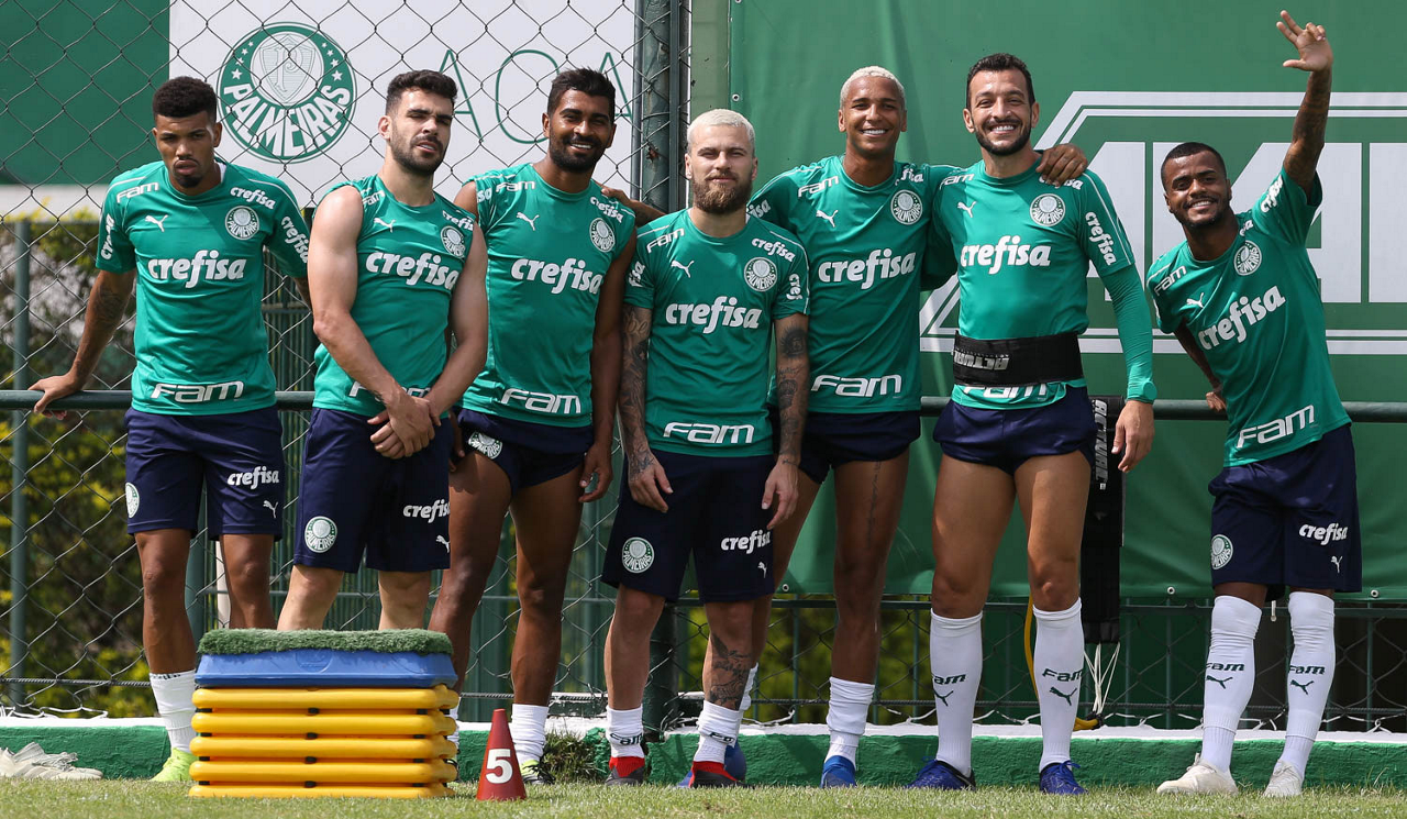 Os jogadores Juninho, Bruno Henrique, Thiago Santos, Lucas Lima, Deyverson, Edu Dracena e Felipe Pires (E/D), da SE Palmeiras, durante treinamento, na Academia de Futebol.