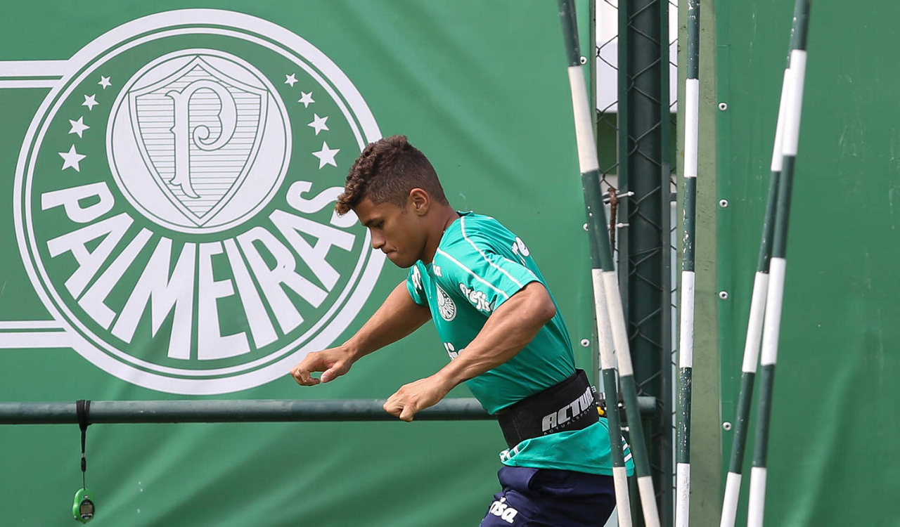 O jogador Yan, da SE Palmeiras, durante treinamento, na Academia de Futebol.