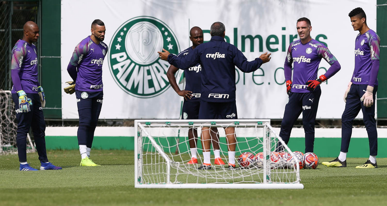Os jogadores Jailson, Weverton, Fernando Prass e Magrão (E/D) e os preparadores de goleiros Thales e Oscar Rogrigues (C), da SE Palmeiras, durante treinamento, na Academia de Futebol.