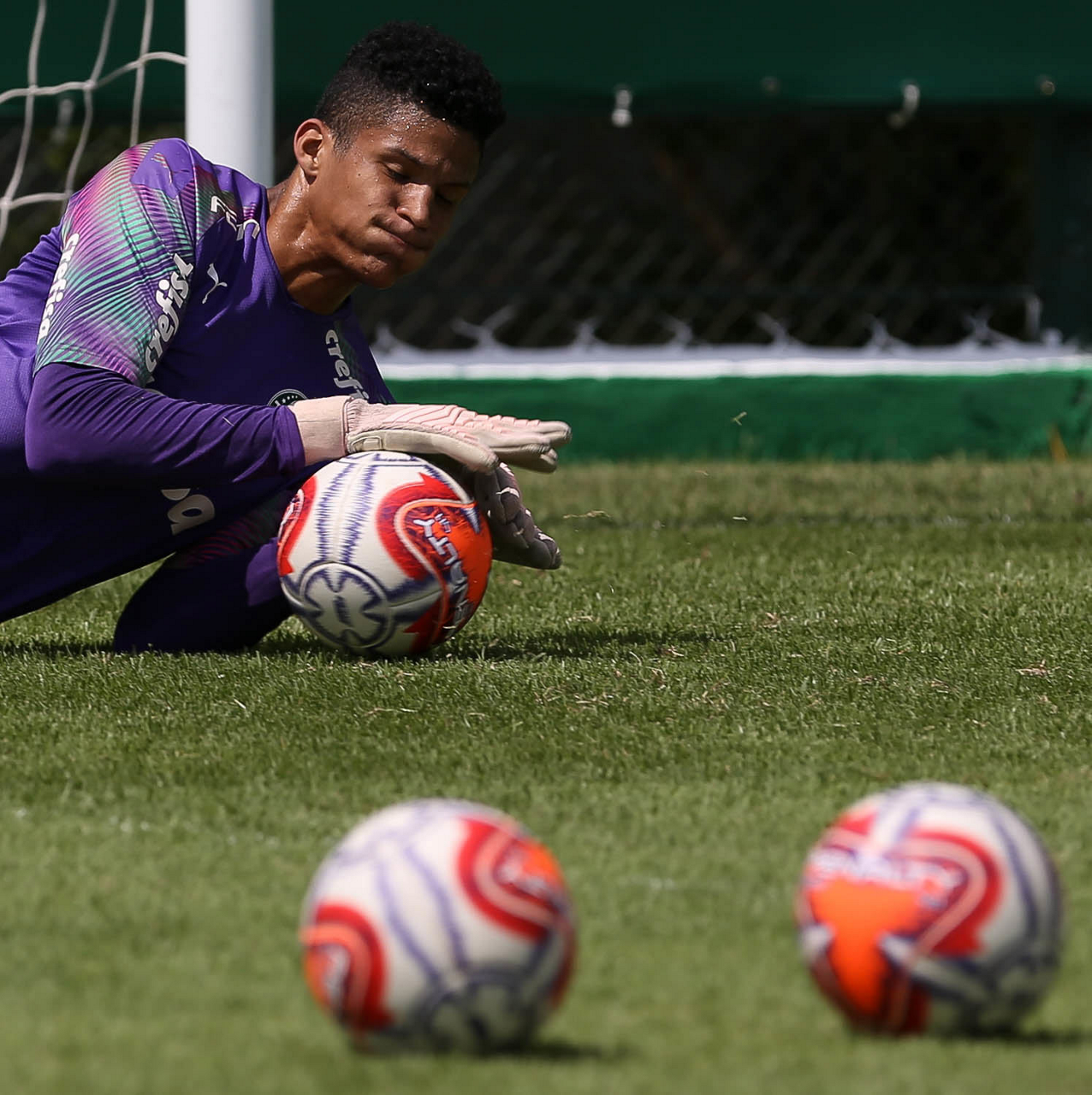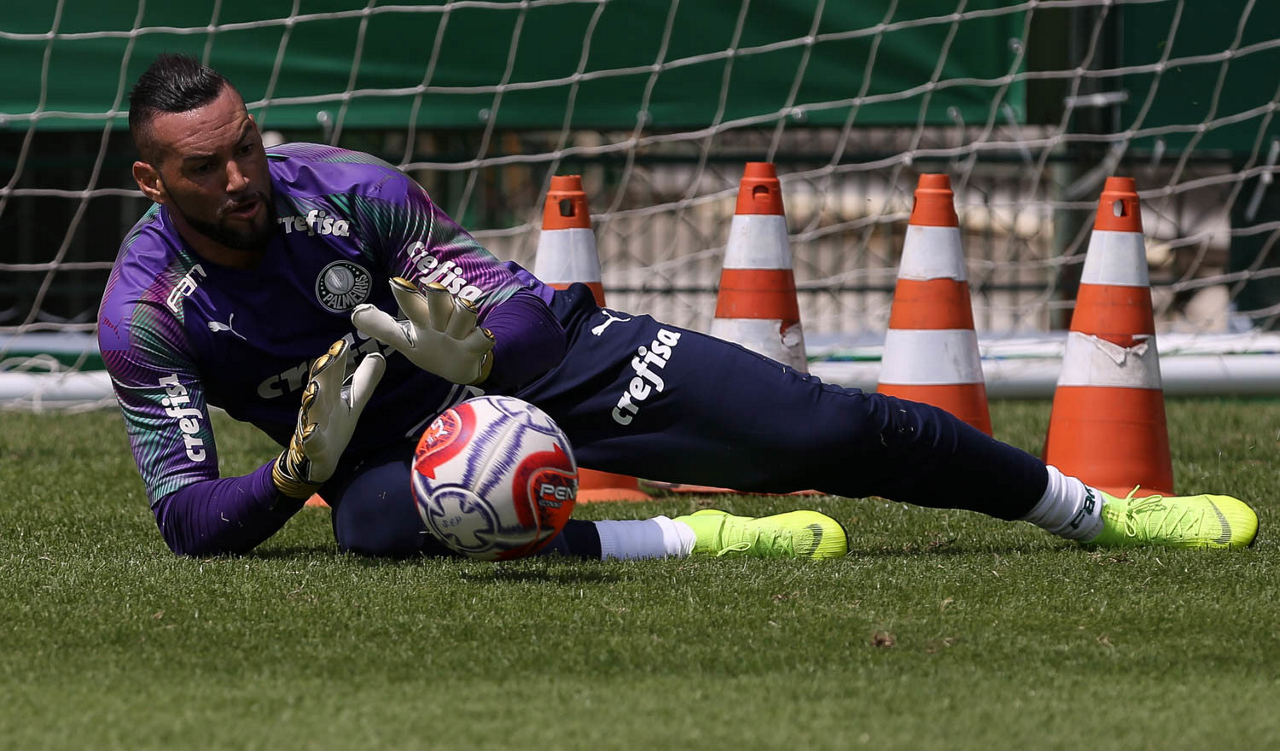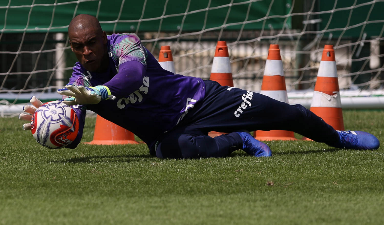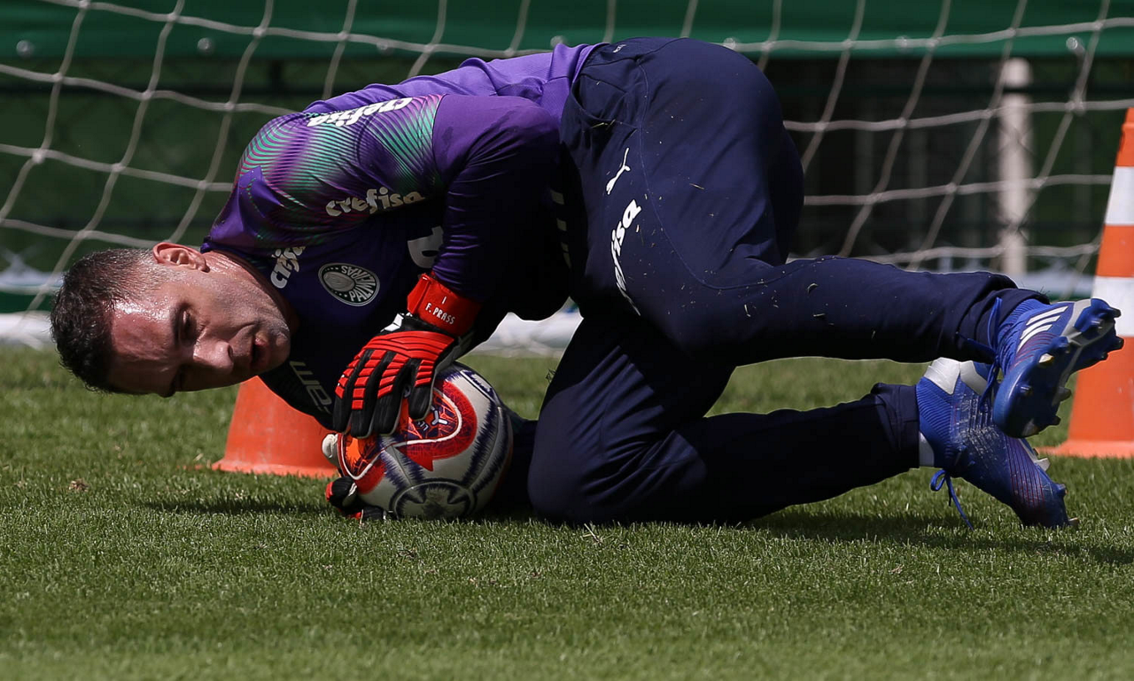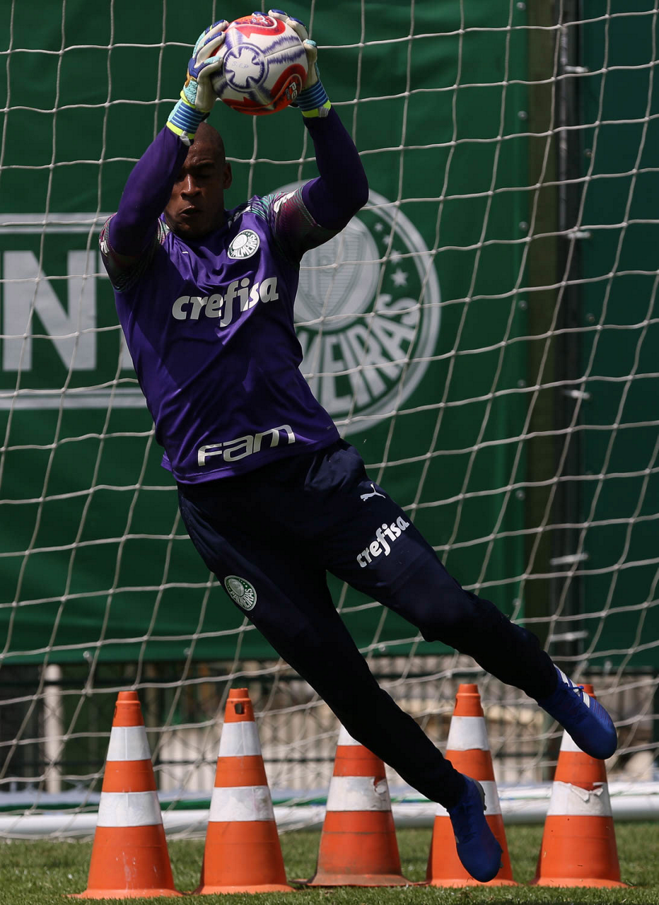 O goleiro Weverton, da SE Palmeiras, durante treinamento, na Academia de Futebol.