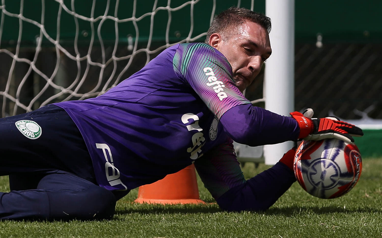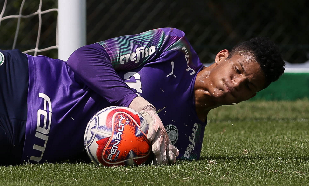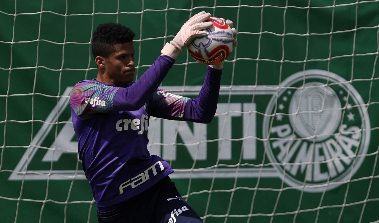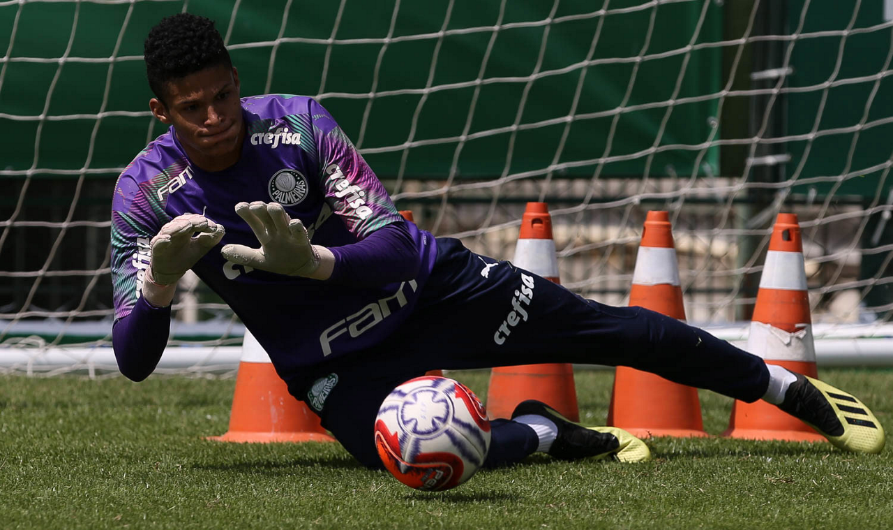 O goleiro Weverton, da SE Palmeiras, durante treinamento, na Academia de Futebol.