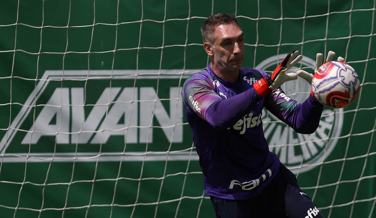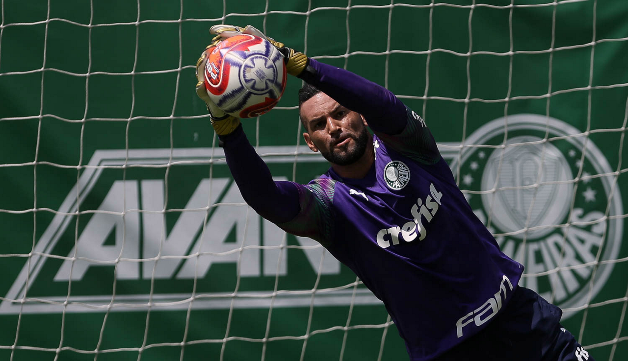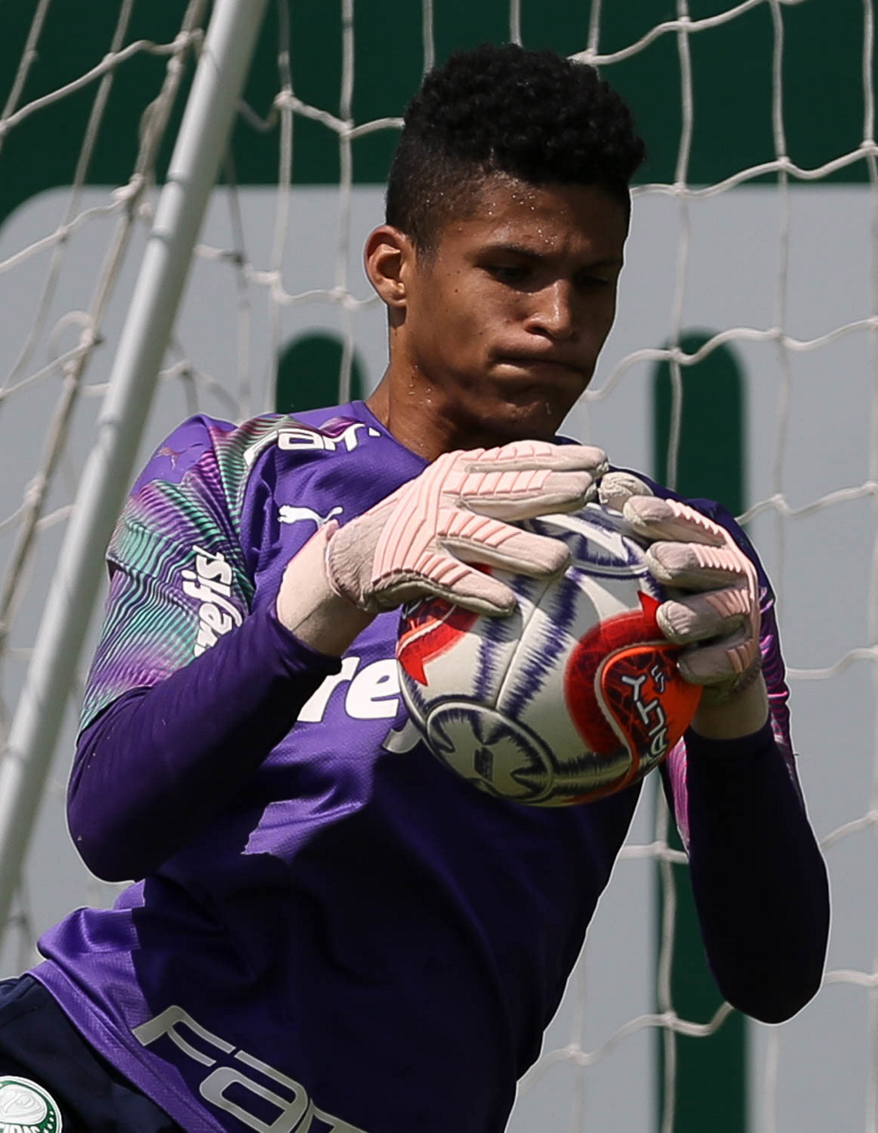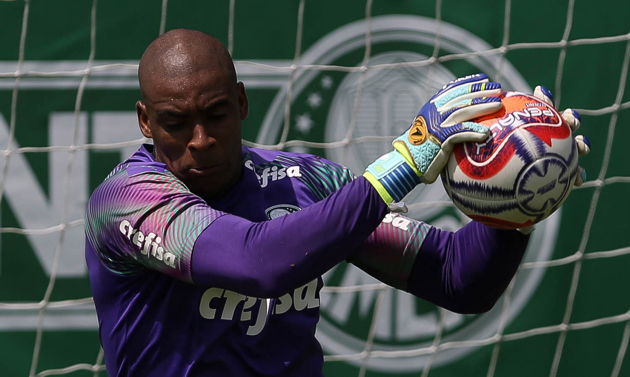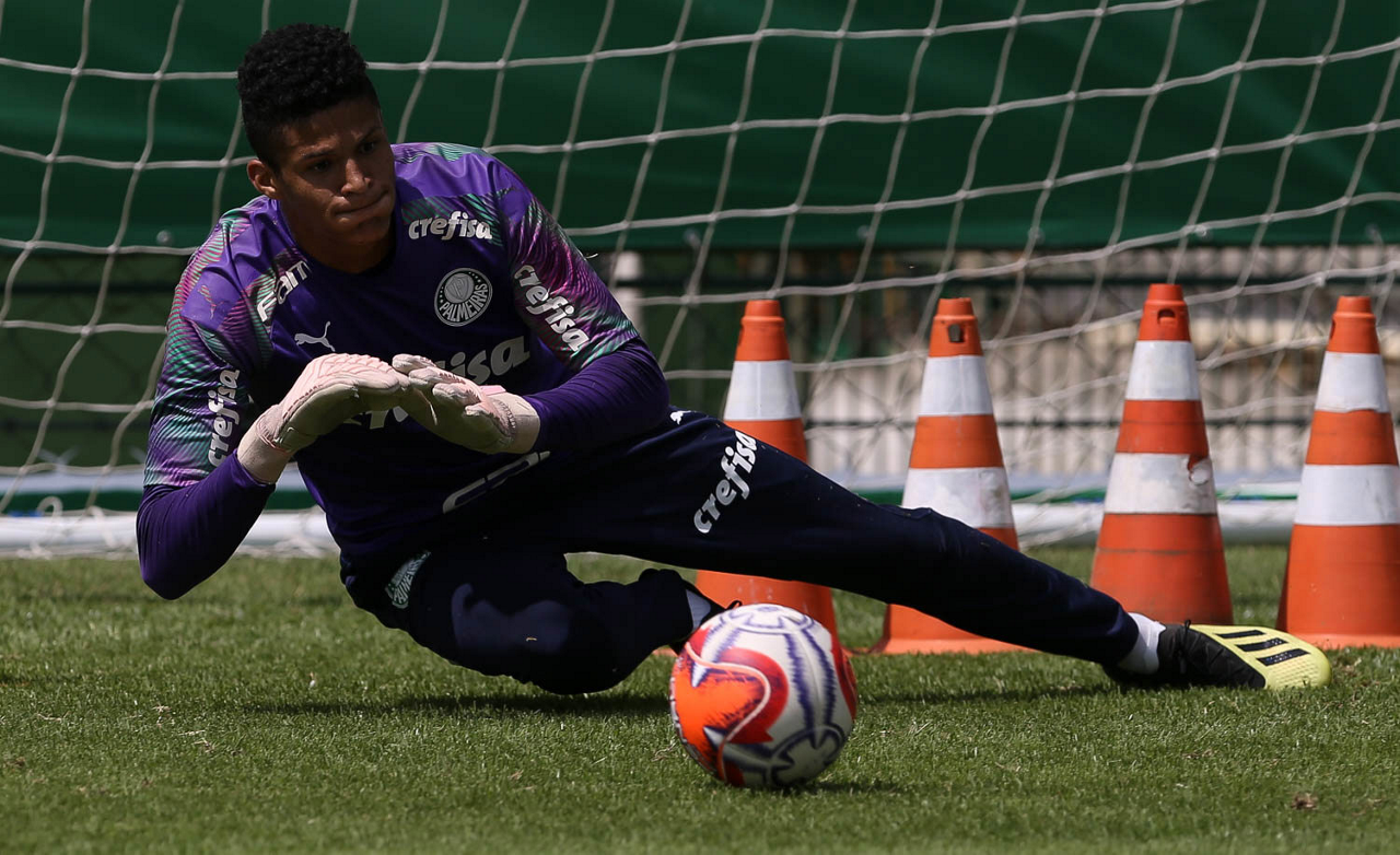 O goleiro Weverton, da SE Palmeiras, durante treinamento, na Academia de Futebol.