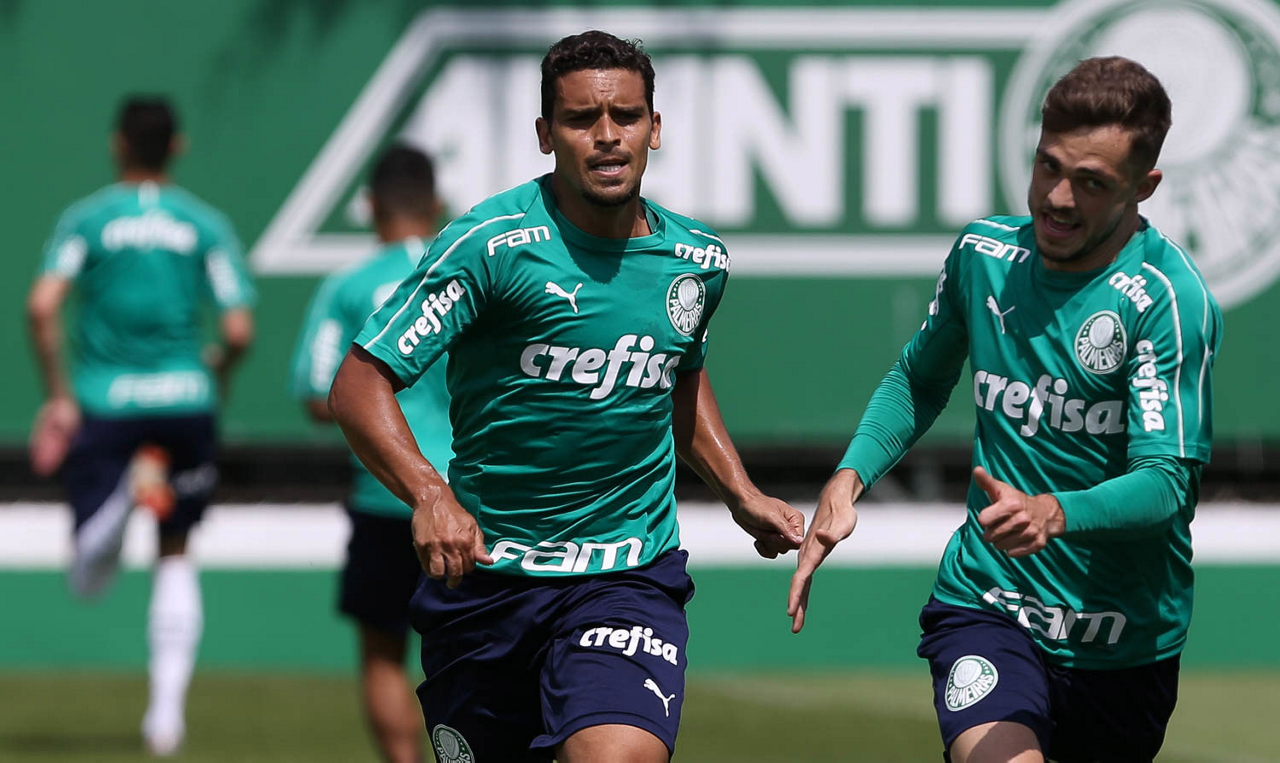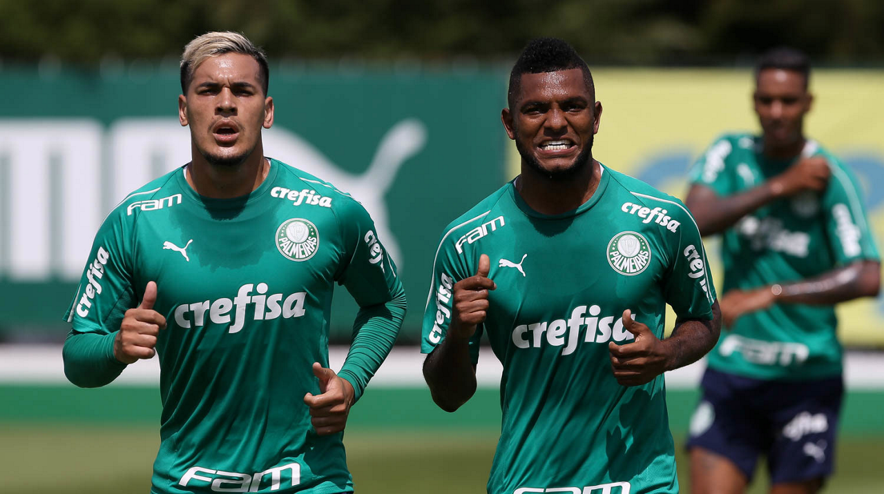 Os jogadores Gustavo Gómez e Borja (D), da SE Palmeiras, durante treinamento, na Academia de Futebol.