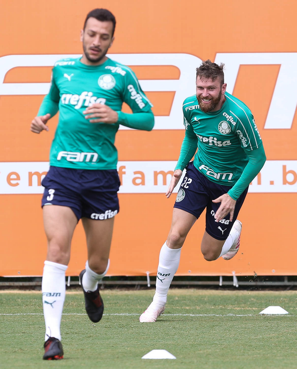 Os jogadores Raphael Veiga e Ricardo Goulart (D), da SE Palmeiras, durante treinamento, na Academia de Futebol.