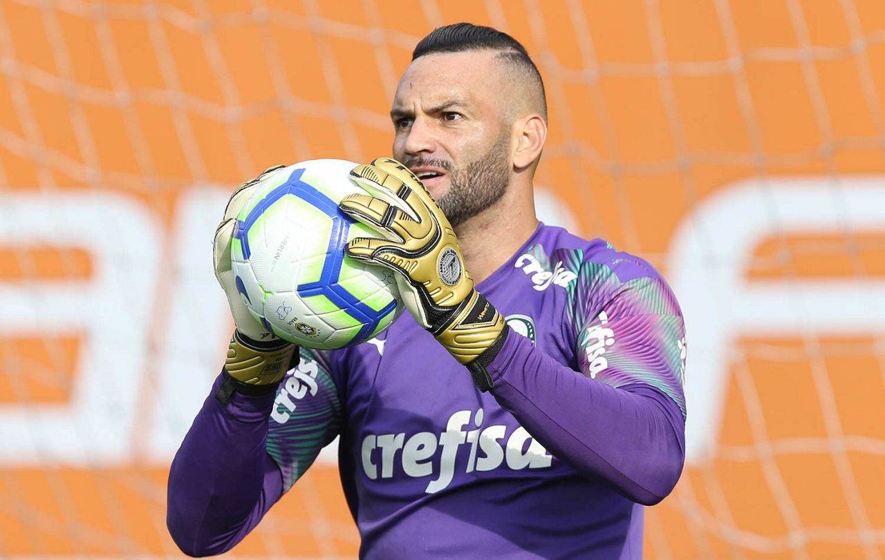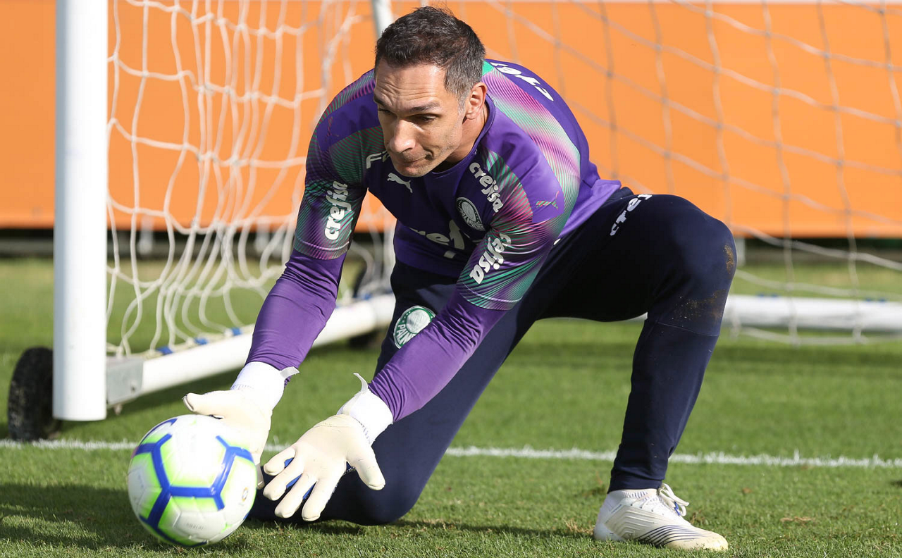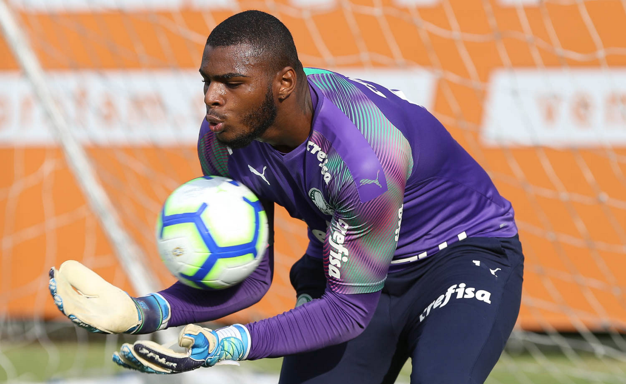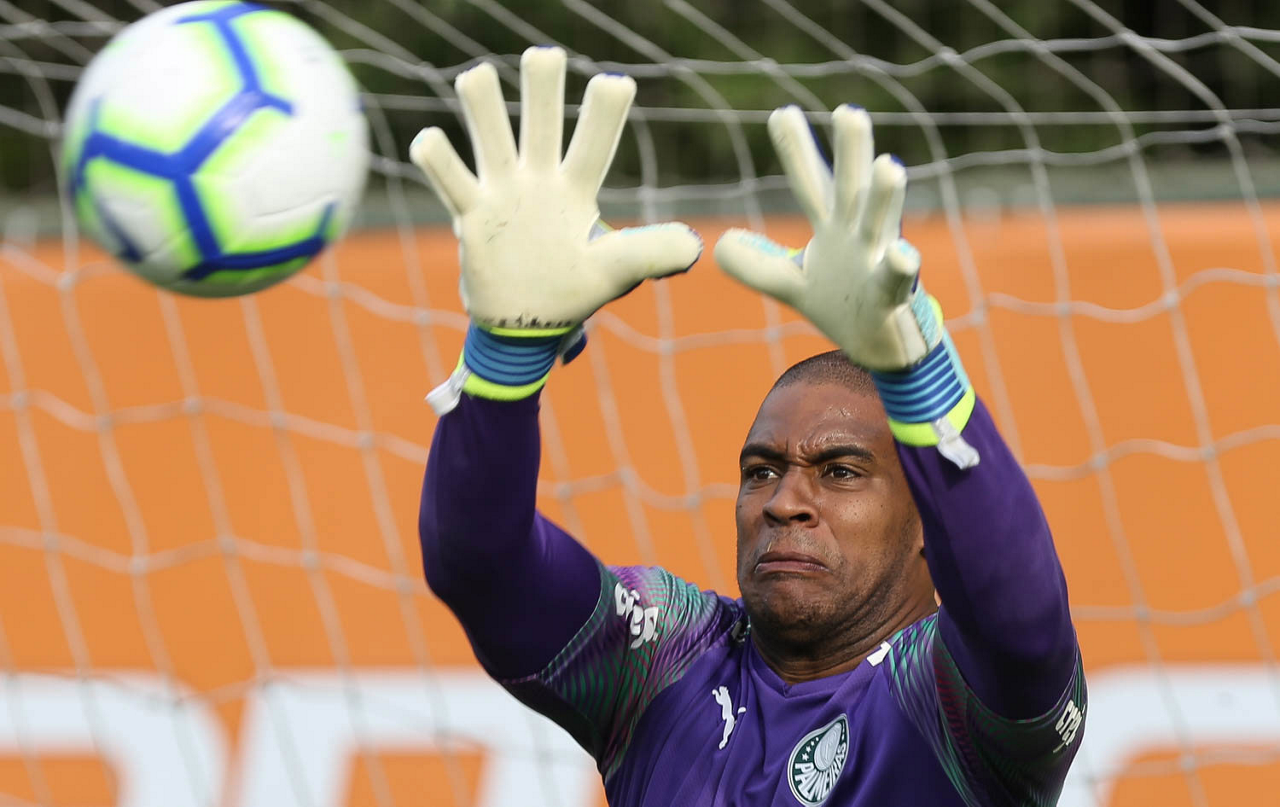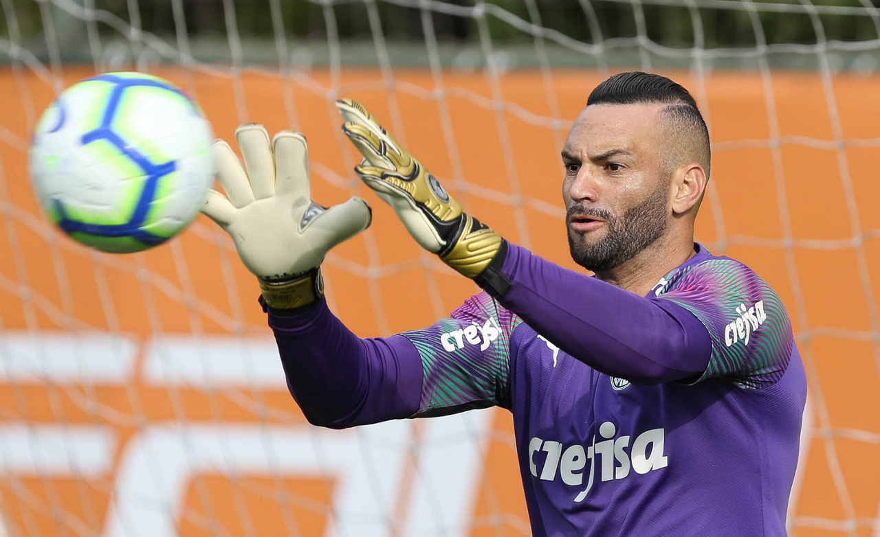 O goleiro Weverton, da SE Palmeiras, durante treinamento, na Academia de Futebol.